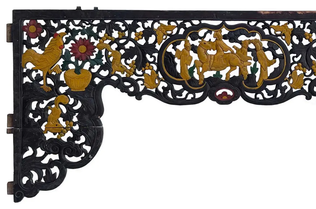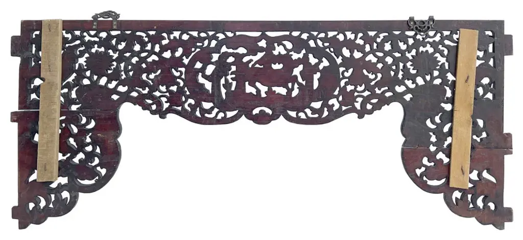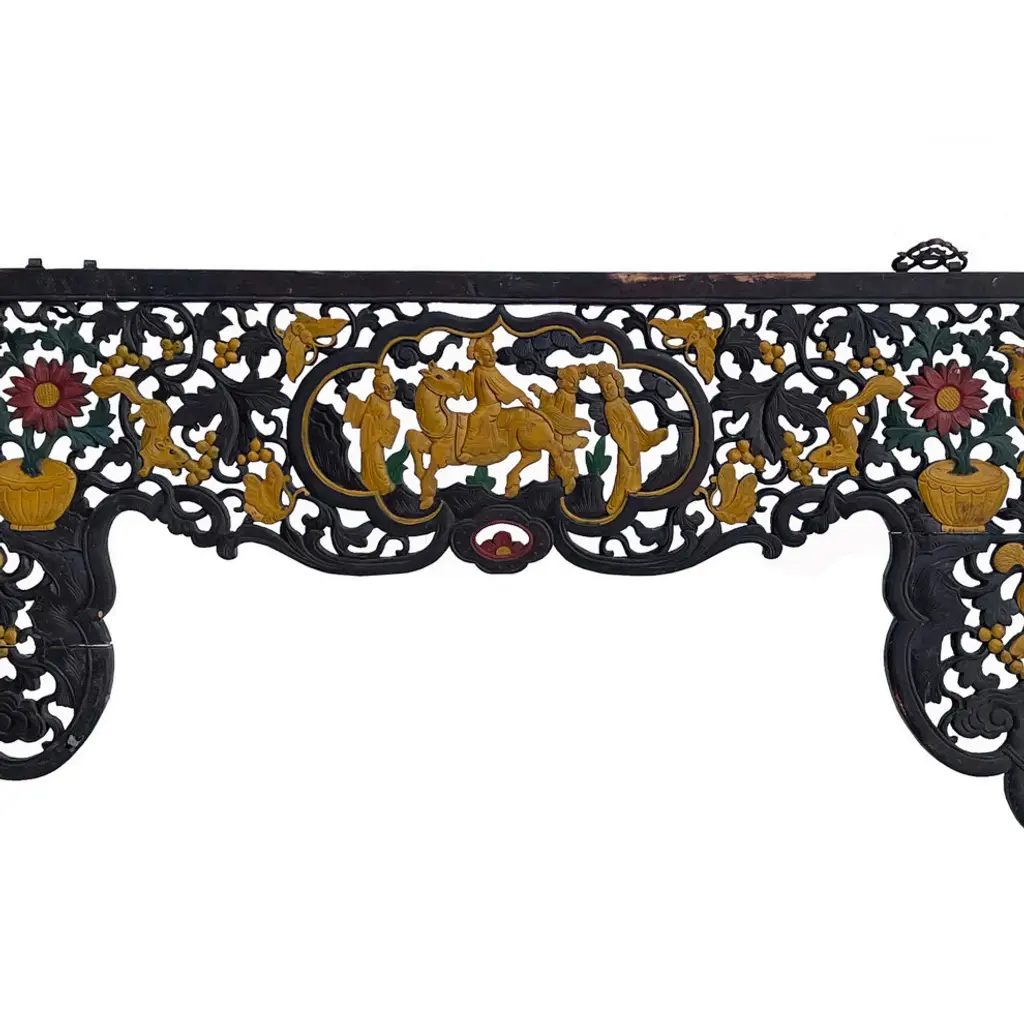 This is a vintage wood carving panel wall art with a dimensional carving motif of floral and people scenery patterns. It was part of furniture or a home roof accent. It is in dark brown black golden rustic color.Dimensions: w47.5" x h21" x thickness 1" , center w27.5" x h10.5"Origin: ChinaMaterial: Elm WoodCondition: Vintage restored, handmade, wood joint lines, distressed rustic, as itUSA domestic continental buyers of 48 states pay $135 shipping (buyers of Hawaii, Alaska, US Islands, and Canada pays the extra shipping cost). Insurance and handling charges are already included in the shipping cost.