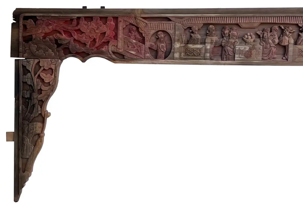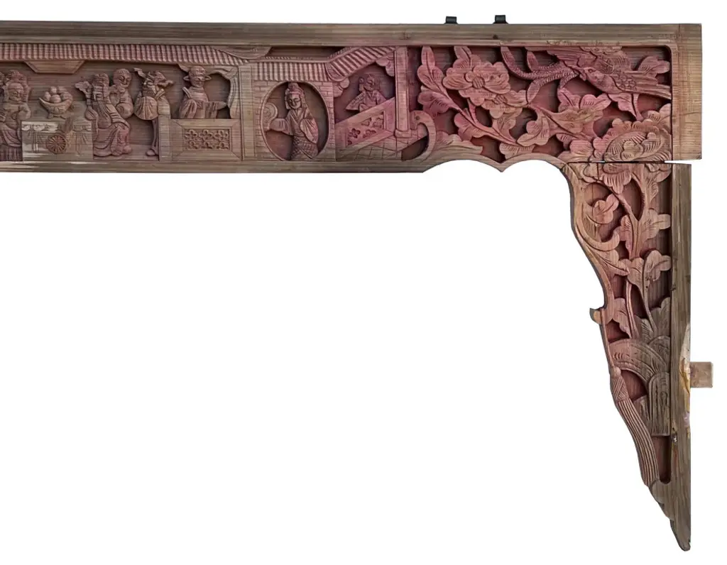 This is a vintage wood carving panel wall art with a dimensional carving motif of floral and people scenery patterns. It was part of furniture or a home roof accent. It is in brown rustic color.Dimensions: w50" x h21" x thickness 1.25" , center w38" x h15"Origin: ChinaMaterial: Elm WoodCondition: Vintage restored, handmade, wood joint lines, distressed rustic, as itUSA domestic continental buyers of 48 states pay $135 shipping (buyers of Hawaii, Alaska, US Islands, and Canada pays the extra shipping cost). Insurance and handling charges are already included in the shipping cost.