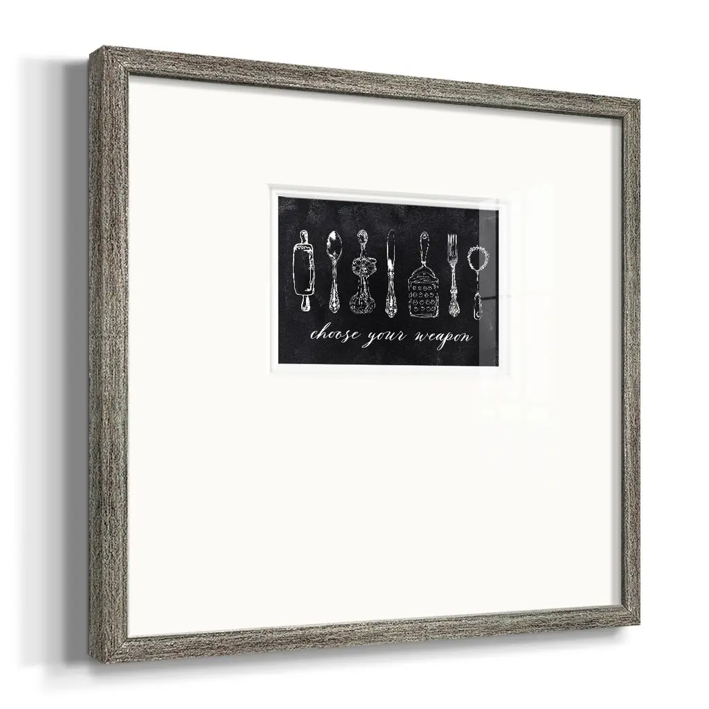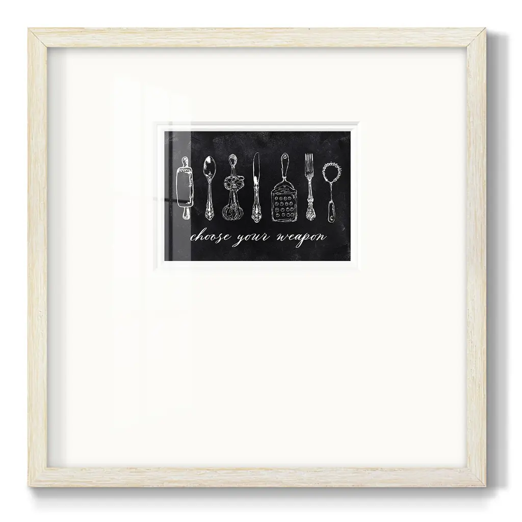 Choose Your WeaponPremium Framed Print A framed cold pressed paper print featuring superior double matting and quality frame. 2 SIZES AVAILABLE 16''X16''' - Overall Size 20''X20''' - Overall Size Each piece is made to order. Each piece comes with hanging hardware. Made in the USA Ready to Hang Giclee Paper Print Plexiglass Beveled Matt Board Double Matte Board