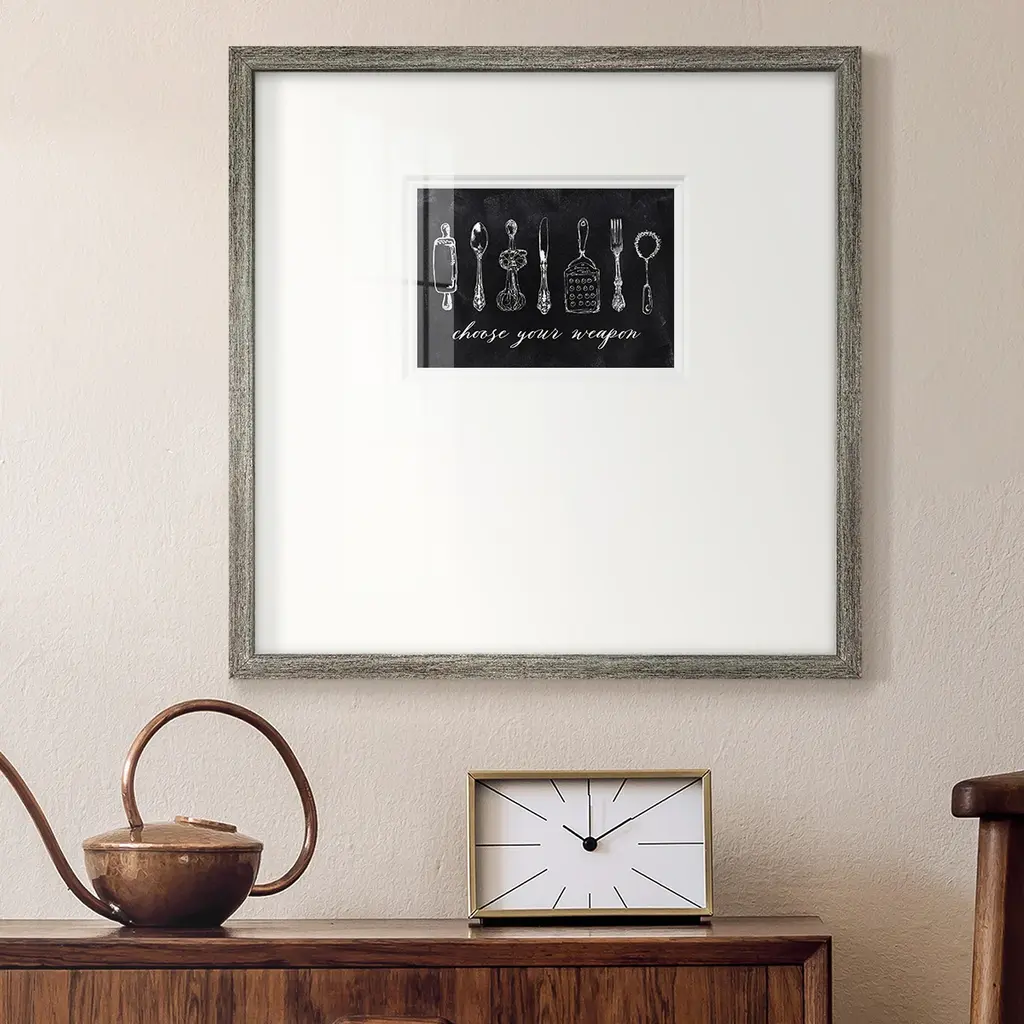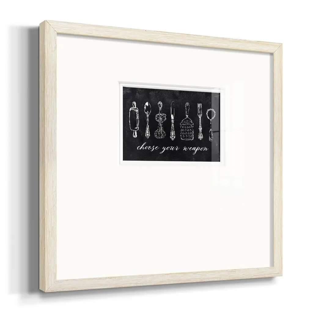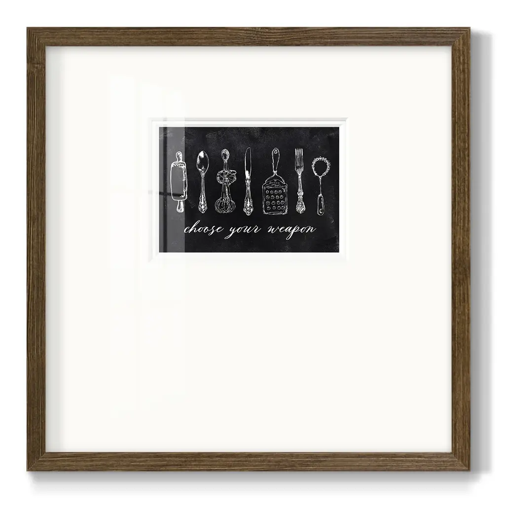 Choose Your WeaponPremium Framed Print A framed cold pressed paper print featuring superior double matting and quality frame. 2 SIZES AVAILABLE 16''X16''' - Overall Size 20''X20''' - Overall Size Each piece is made to order. Each piece comes with hanging hardware. Made in the USA Ready to Hang Giclee Paper Print Plexiglass Beveled Matt Board Double Matte Board