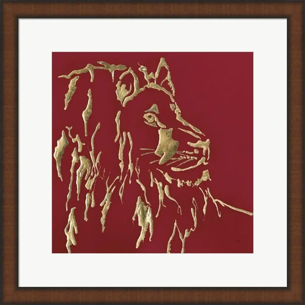 Gilded Lion on Red by Chris Paschke is a high quality piece of framed artwork. The finished size of this piece is 20.75" X 20.75". It has a Slim Teak with Espresso Brown Edges frame, is single matted and finished with high quality Acrylic Plexiglass.