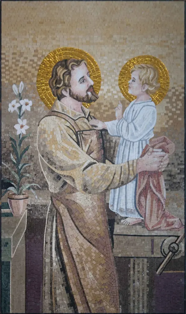 Introducing the Christian Mosaic - Jesus Mosaic, a stunning representation of faith and artistry that beautifully captures the essence of devotion. This exquisite handcrafted piece features a meticulous reproduction of Baby Jesus and Saint Joseph, created from premium quality natural stones to form a mesmerizing design that resonates deeply with the heart of Christianity. Each stone is carefully selected and placed by skilled artisans, ensuring every intricate detail of this divine representation is brought to life. The mosaic’s design reflects the warmth and innocence of Baby Jesus, while Saint Joseph stands by, radiating strength and protection. This luxury stone artwork is perfect for both indoor and outdoor spaces, ideal for adorning your living room, creating a serene garden atmosphere, or establishing a sacred space for reflection. Its durable construction withstands the elements while maintaining vibrant colors and captivating details. A highlight of this mosaic is the inclusion of luminous Brown Quartz, whose crystalline, jewel-like shimmer adds a radiant depth and prismatic brilliance to the composition. This scintillating brown hue enriches the mosaic with a warm, earthy elegance that complements the spiritual theme and elevates the overall aesthetic. As both a cherished gift and an inspiring addition to your collection, the Christian Mosaic - Jesus Mosaic embodies an enduring message of faith, hope, and unity. Each unique piece invites contemplation of spirituality’s beauty and serves as a timeless reminder of Jesus’s significance in our lives. Let this exquisite creation uplift your spirit and enhance your space with the light of faith and the silky, cool-to-the-touch luxury of exotic natural stone materials.