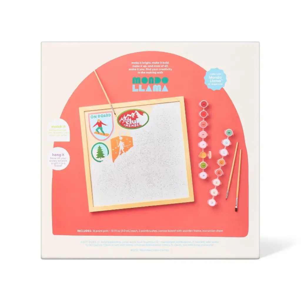 This Christmas Craft Ski Paint by Number Kit from Mondo Llama™ brings the joy of creating beautiful winter artwork to your holiday crafting. This DIY paint-by-number framed canvas kit includes one pre-printed and numbered canvas board with a wooden frame along with 16 paint pots, three paintbrushes and an instruction sheet for easy, guided painting. Recommended for ages six and above, this nontoxic kit creates a beautiful piece of seasonal art that can be proudly displayed year after year.Mondo Llama™: Find your creativity in the making.