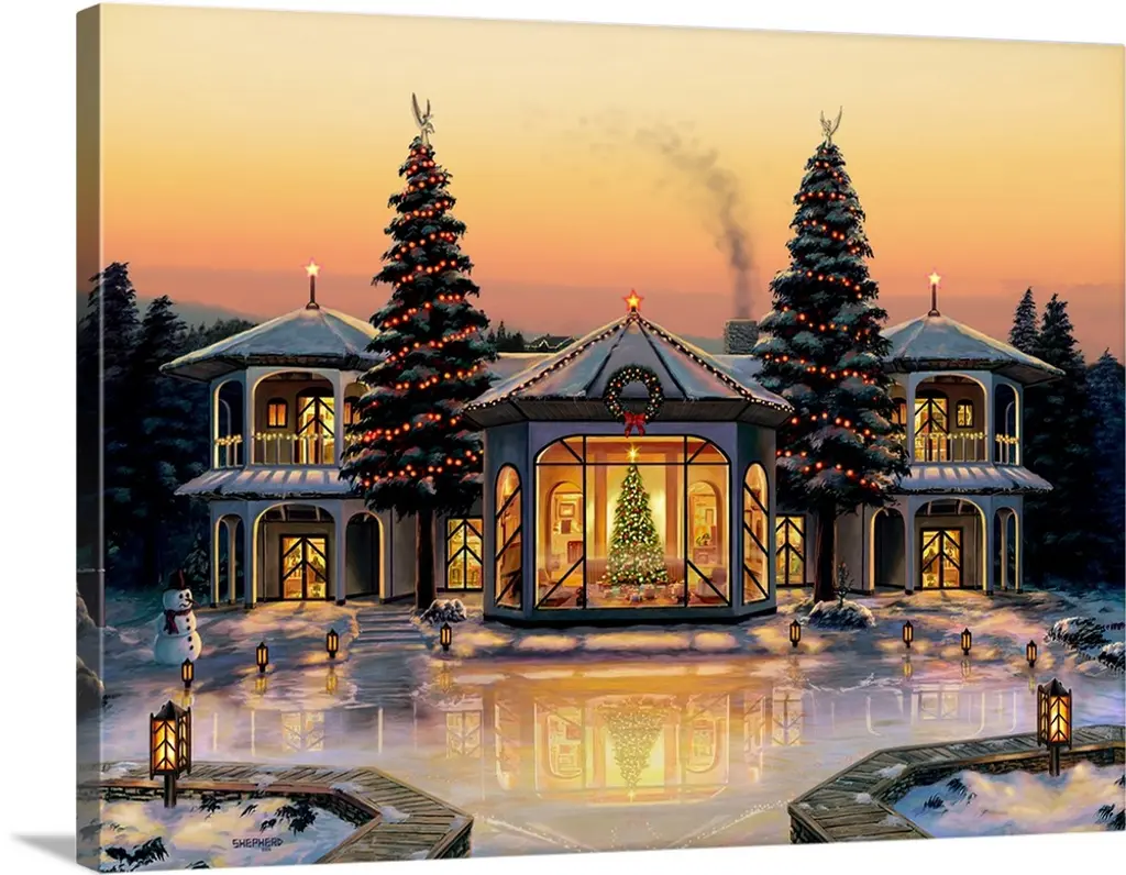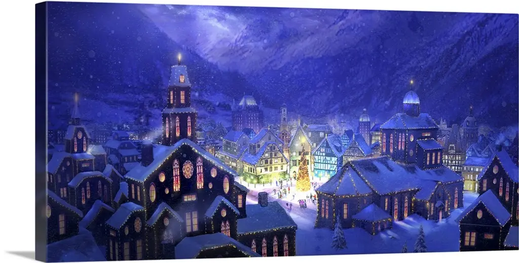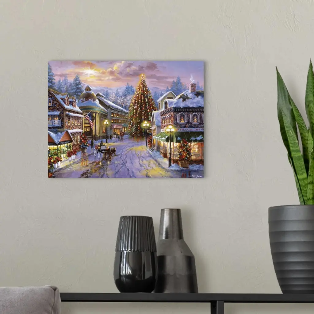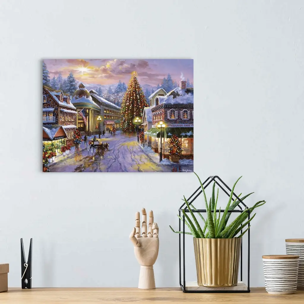 Painting of village scene featuring a large Christmas tree. Product is a painting reproduction only, and does not contain actual lights.