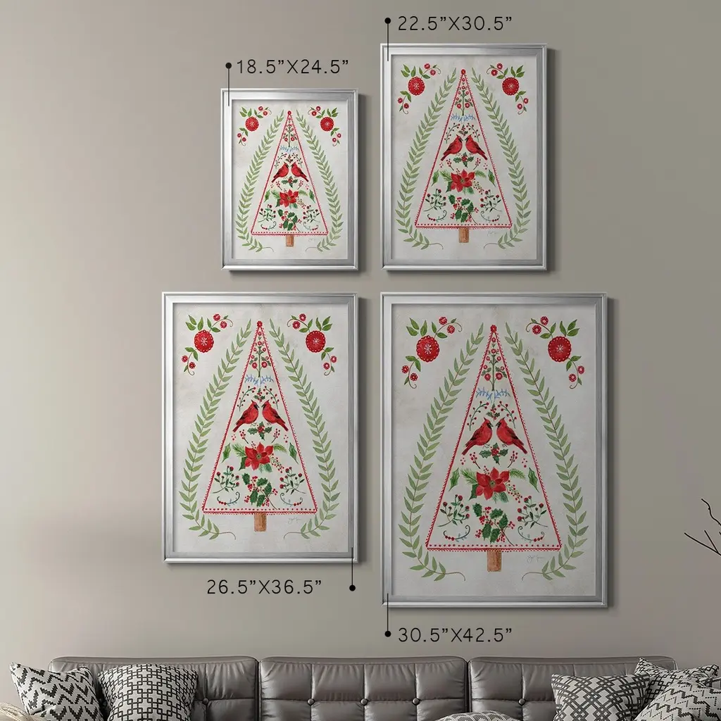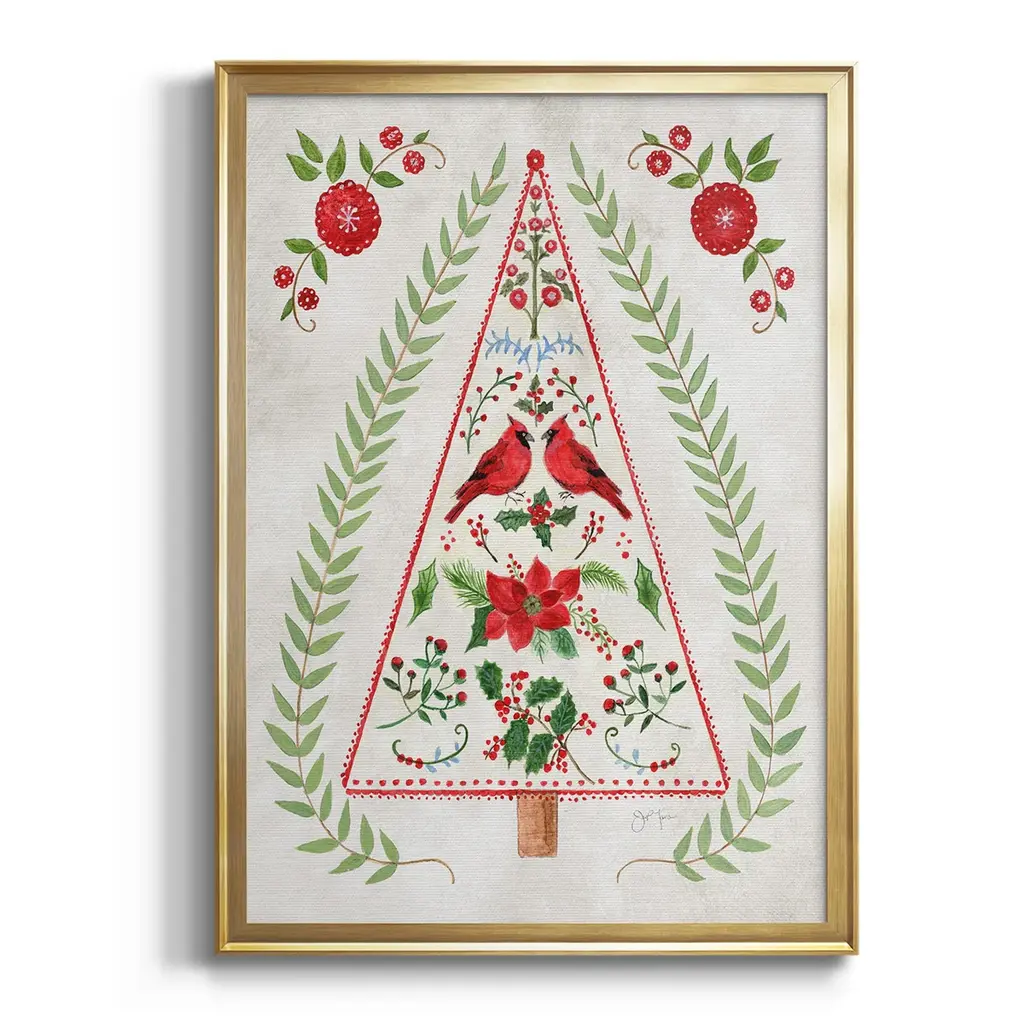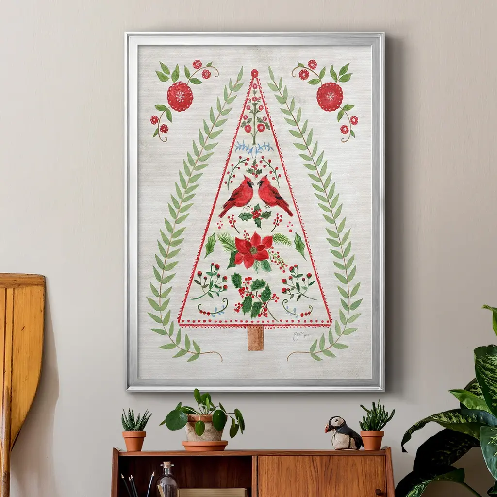 Christmas Folk Tree Premium Framed Print - Ready to Hang A Premium Framed Print created to last. Framed in distressed wood and available in an array of sizes and colors Featuring a beveled a solid wood stretcher bar, each piece comes ready to hand 4 SIZES AVAILABLE 30.5''X42.5'' - Overall Size 26.5'X36.5'' - Overall Size 22.5''x30.5'' - Overall Size 18.5''x24.5'' - Overall Size Each piece is made to order. Each piece comes with hanging hardware. Made in the USA Ready to Hang