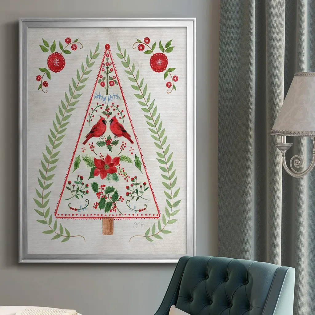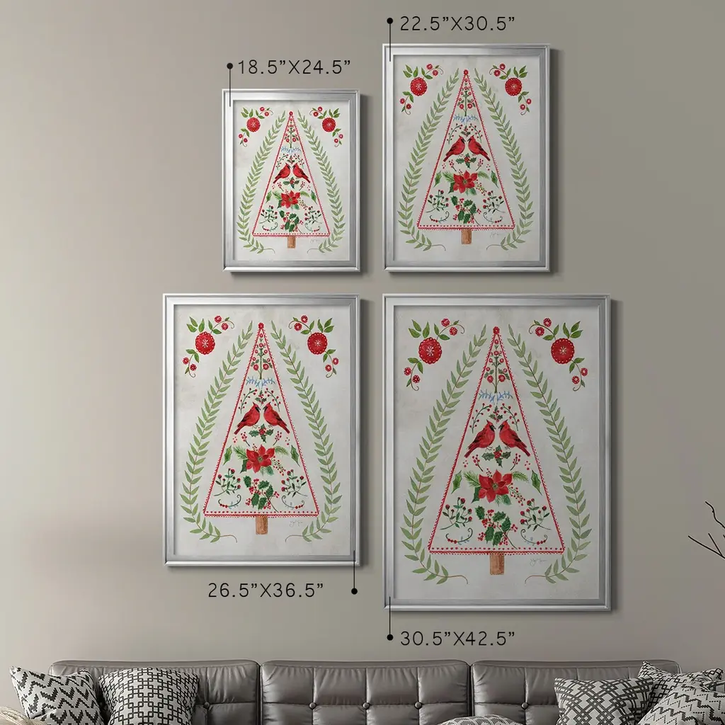 Christmas Folk Tree Premium Framed Print - Ready to Hang A Premium Framed Print created to last. Framed in distressed wood and available in an array of sizes and colors Featuring a beveled a solid wood stretcher bar, each piece comes ready to hand 4 SIZES AVAILABLE 30.5''X42.5'' - Overall Size 26.5'X36.5'' - Overall Size 22.5''x30.5'' - Overall Size 18.5''x24.5'' - Overall Size Each piece is made to order. Each piece comes with hanging hardware. Made in the USA Ready to Hang