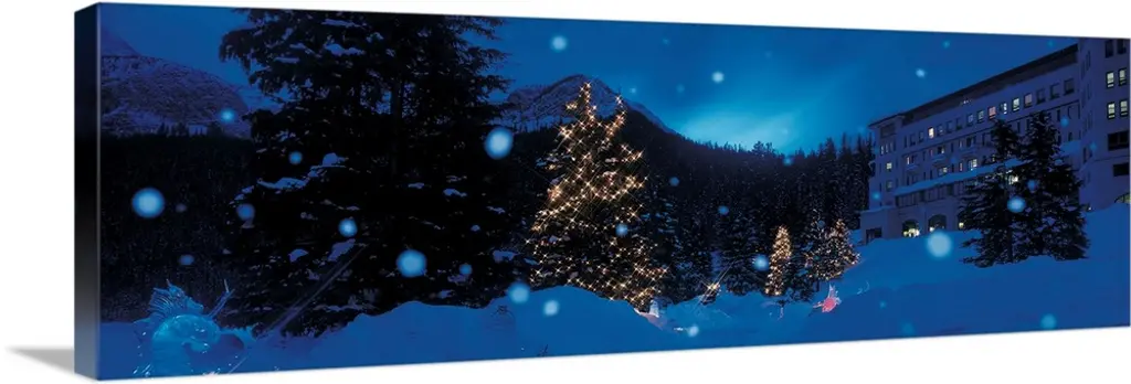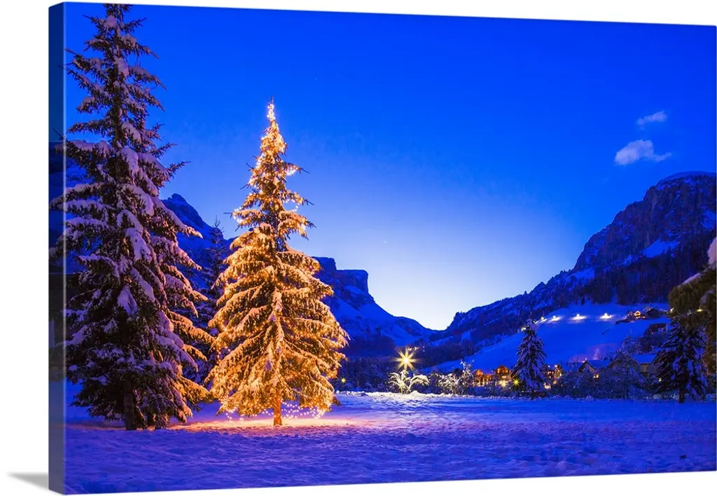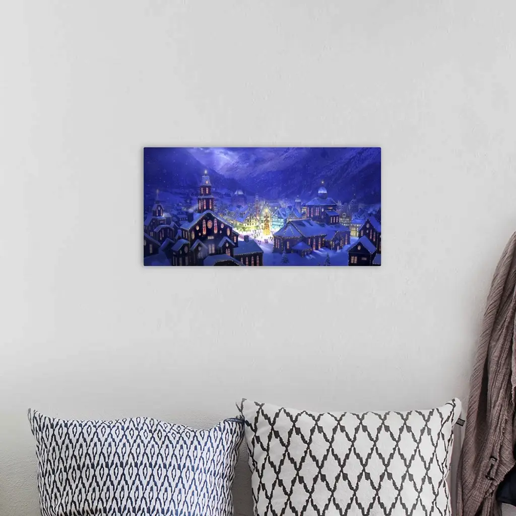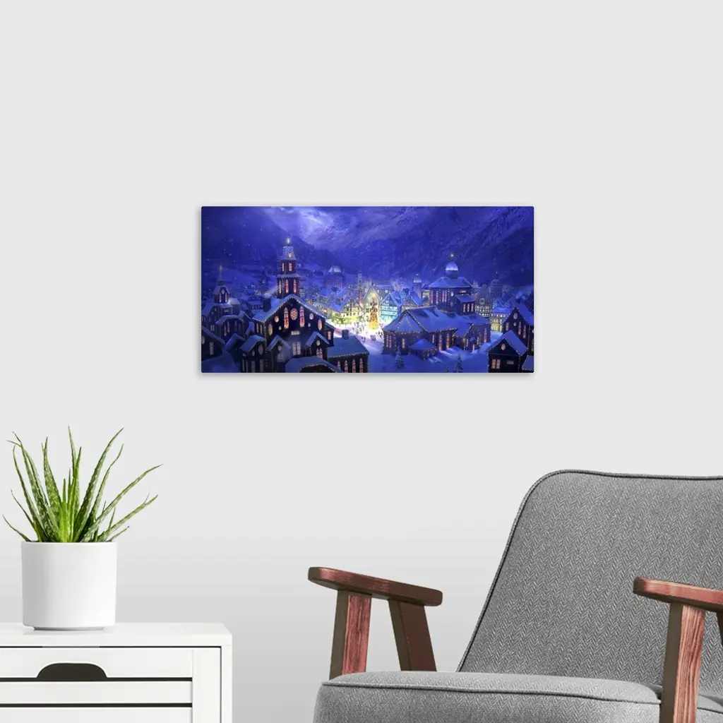 Contemporary artwork of a snowy mountain village illuminated by the Christmas put up by the town.