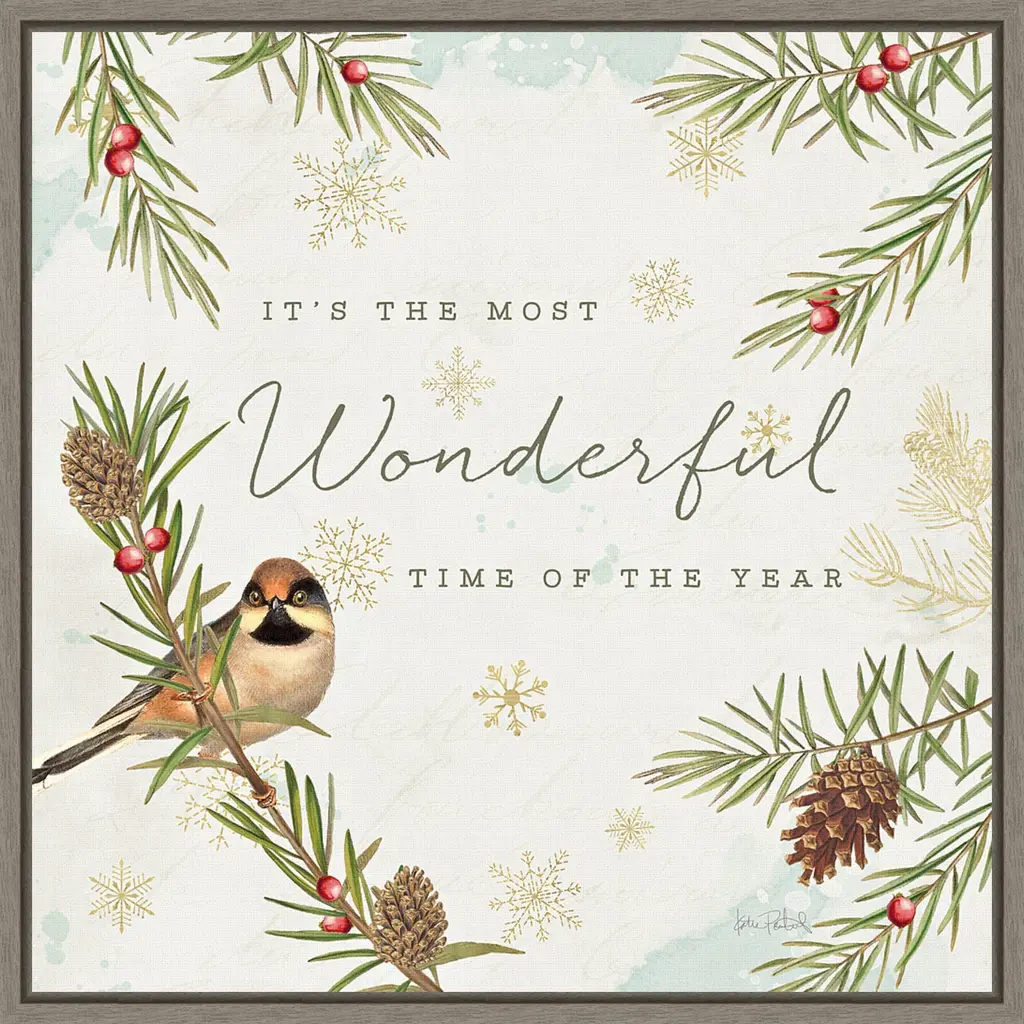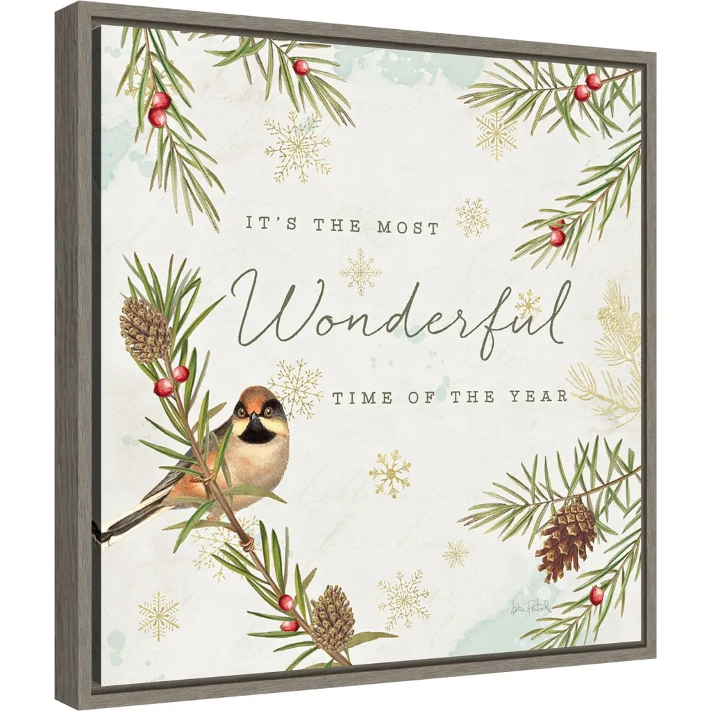 As this picturesque illustration of a perched bird on branches of holly and pinecones reminds us, it is in fact the most wonderful time of the year. Celebrate with this painting that is composed of soft, muted snowflakes and branches in the background.Features:FLOAT FRAMED CANVAS ART: Canvas is framed in a floated style that showcases a narrow gap between the edge of the gallery wrapped canvas and the frame. The wrapped canvas appears as if it's "floating" on the frame. The overall look is clean, modern and upscale.QUALITY: Canvas is printed with high quality, fade-resistant inks and stretched to hide corner folds. Canvas is stretched across a solid surface to resist sagging.AUTHENTICITY: Canvas is printed and professionally framed in Madison, Wisconsin USA with authentically licensed artwork.EFFORTLESS HANGING: Ready to hangfor easy installation. The metal sawtooth hangers come attached on the inset back for easy wall display.CUSTOM PACKAGED: Canvas is custom packaged for protection in shipment to arrive without damage.Details:Artist: Katie PertietTitle: Christmas Tradition IV (Bird)Product type: Framed Canvas BoxStyle: Modern ContemporaryFormat: squareSize: SmallSubject: Still LifeFrame: Sylvie Greywash .5"Image dimensions: 14.50 inches high x 14.50 inches wideOutside dimensions: 16 inches high x 16 inches wide x 1.875 inches deep