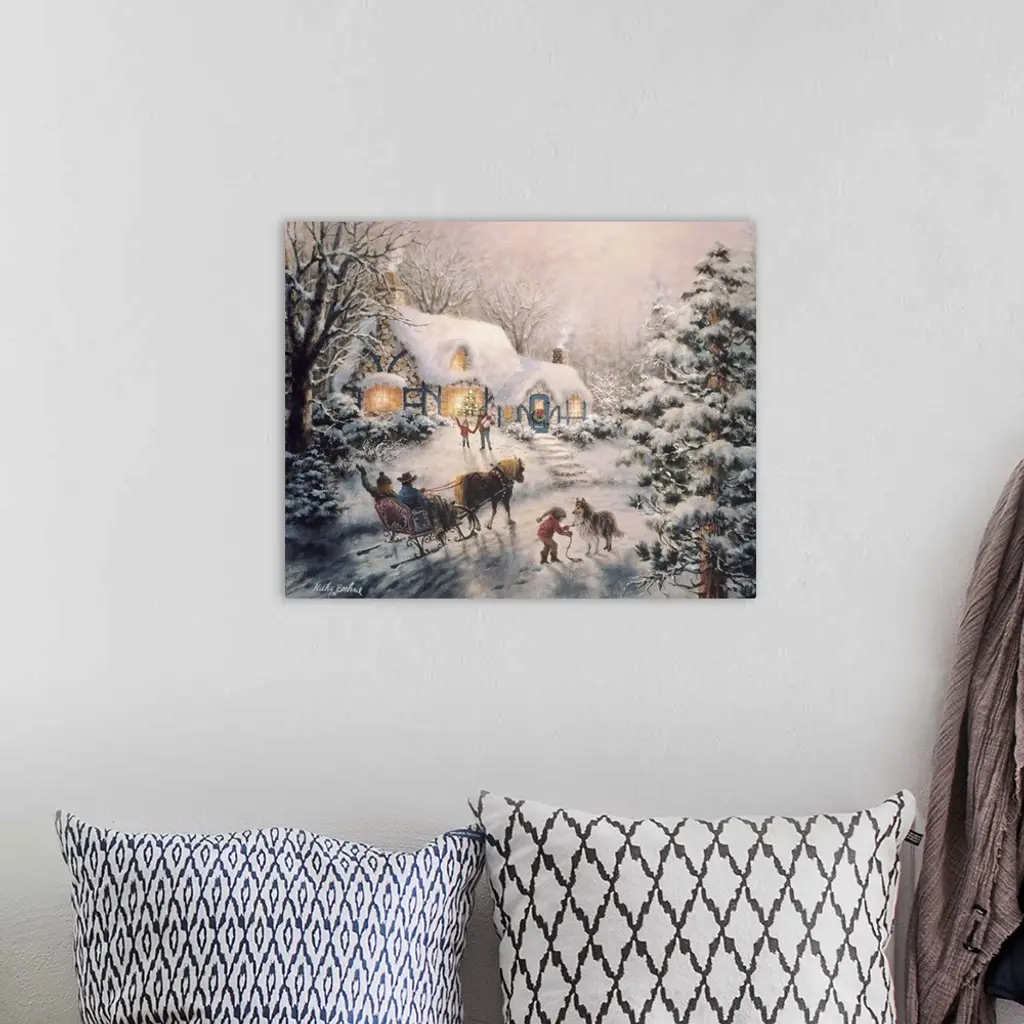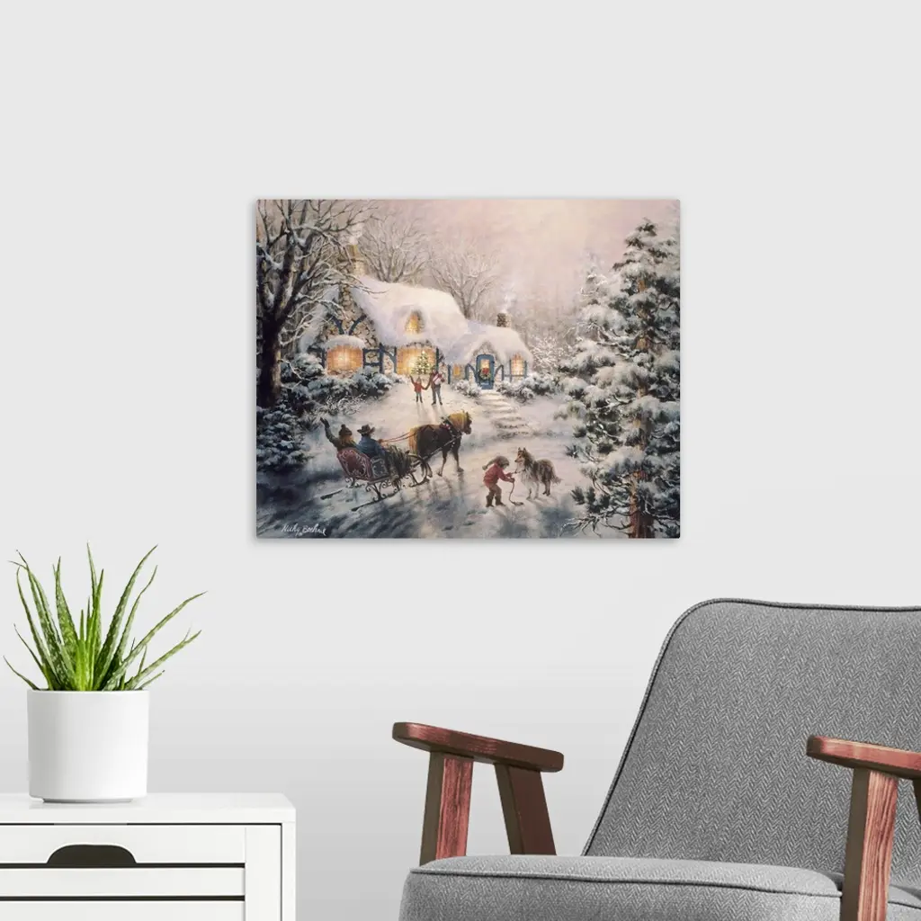Painting of a snow-covered cottage with a horse-drawn sleigh outside. Product is a painting reproduction only, and does not contain actual lights.