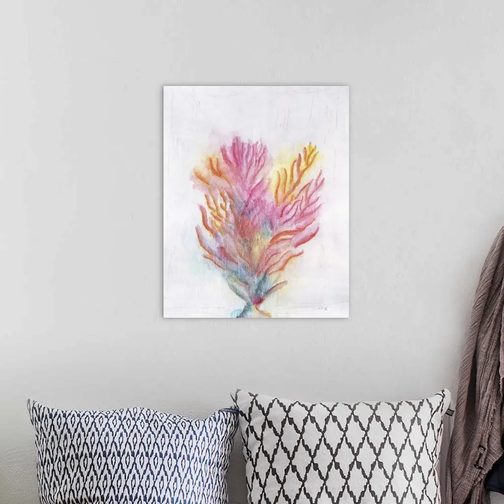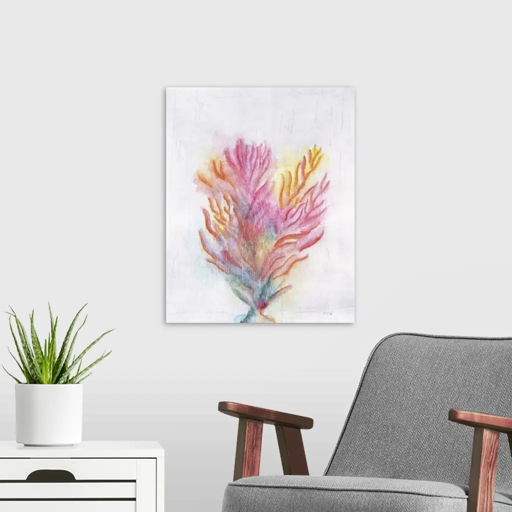 Colorful painting of coral on a white and gray textured background.
