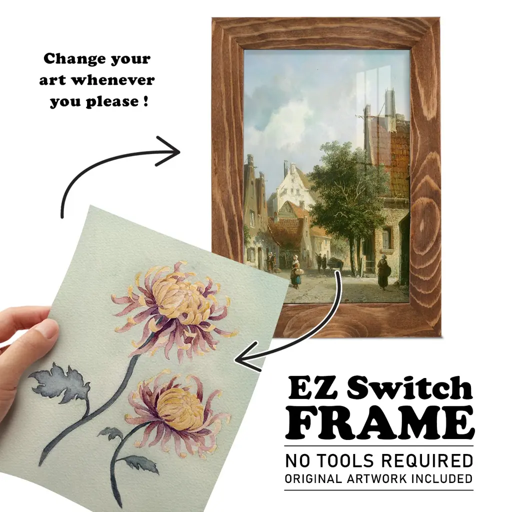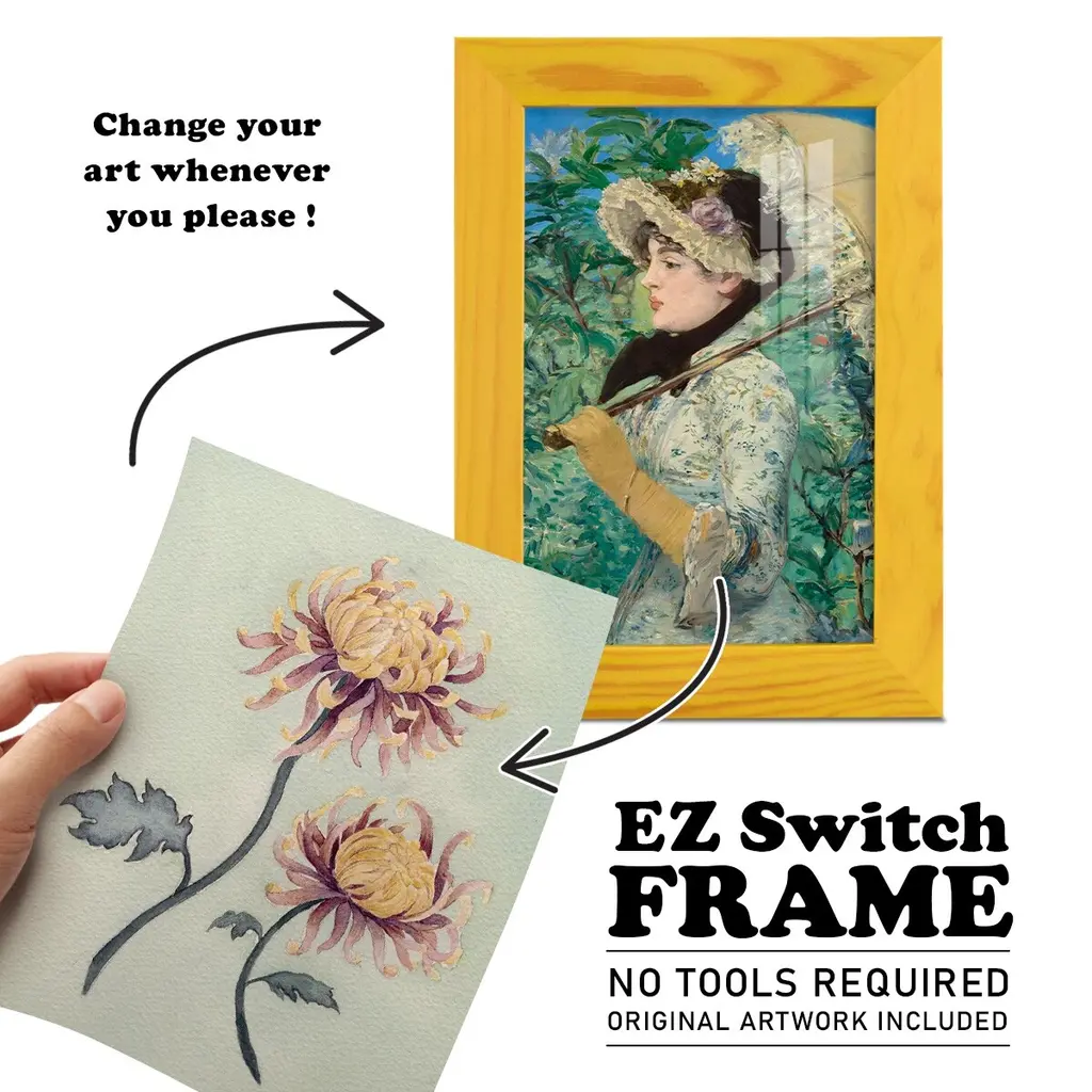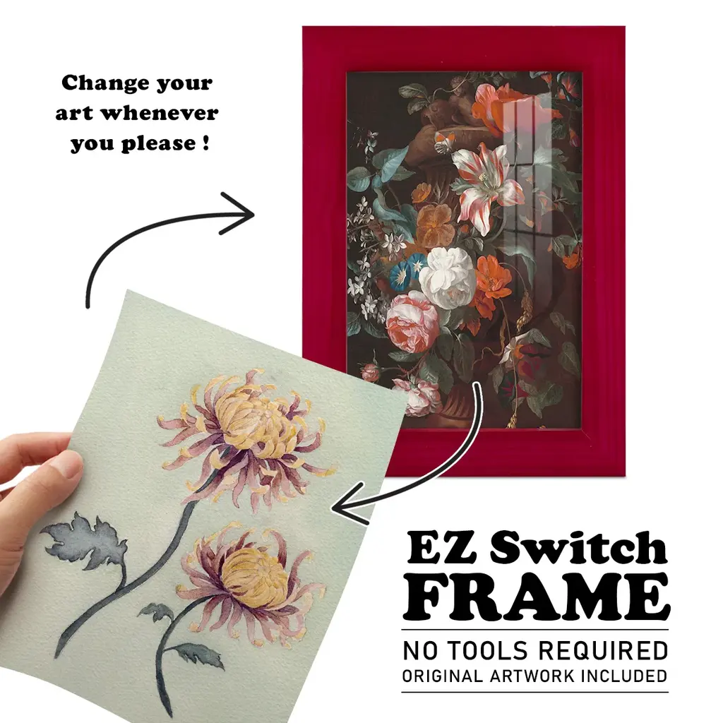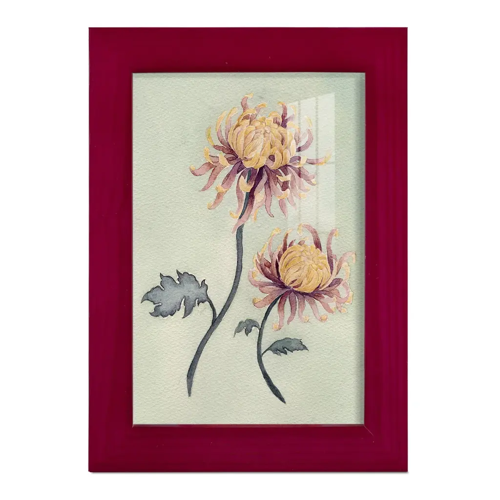 Chrysanthemum Beauty II -EZ SWITCH Framed Print w/glass-Cherry Red A delightful, framed print. Featuring a solid wood frame with real wood glass. This premium print is giclee quality. In addition, every frame features a removable back and table top stand. This allows you to change your art in the future or to just stand the art on a table for a new look. We are sure you'll enjoy our new series of EZ SWITCH Framed Art. Solid Wood Frame Real Glass Removable / Replaceable Art Built in Tabletop Stand Sizes range from 4x6 up to 12x15 - buy just one or pair them up as sets as you see fit.