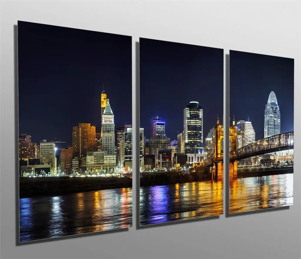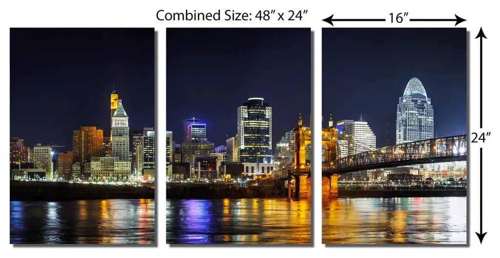 48"œ x 24"œ total size. Ready To Hang! (3 pieces - 16"œ x 24"œ each). 3 Panel Split (Triptych) Metal Print of Cincinnati, Ohio Skyline at night. Modern metal wall art for home or office wall decor & interior design. Printed on Luxurious, HD aluminum glossy metal panels. Multi panel art.. HD aluminum panels. Metal print wall art. Includes Shadow Wall Mount on the back.• Aluminum Metal Wall Art• Made in USA• Ready to hang - No assembly required• Shadow mount hardware on the back• 0.045"œ thick HD Aluminum Panels• Scratch resistant, glossy finish• Superb color clarity, luxurious prints• Epson printing process• For indoor or moisture rich environment use• Easy to clean. Gently wipe with microfiber cloth.