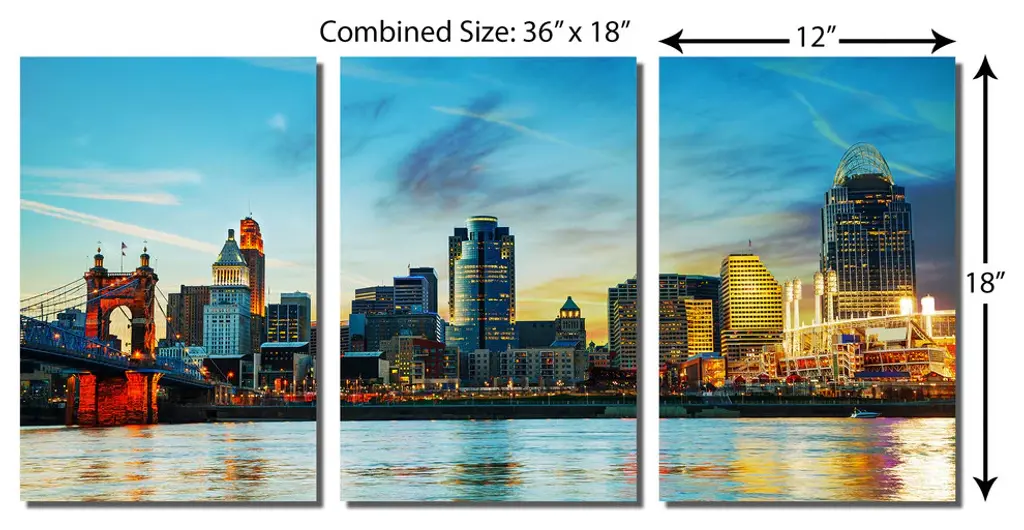 60"œ x 30"œ total size. Ready To Hang! (3 pieces - 20"œ x 30"œ each). 3 Panel Split (Triptych) Metal Print of Cincinnati, Ohio Skyline at night. Modern metal wall art for home or office wall decor & interior design. Printed on Luxurious, HD aluminum glossy metal panels. Multi panel art.. HD aluminum panels. Metal print wall art. Includes Shadow Wall Mount on the back.• Aluminum Metal Wall Art• Made in USA• Ready to hang - No assembly required• Shadow mount hardware on the back• 0.045"œ thick HD Aluminum Panels• Scratch resistant, glossy finish• Superb color clarity, luxurious prints• Epson printing process• For indoor or moisture rich environment use• Easy to clean. Gently wipe with microfiber cloth.