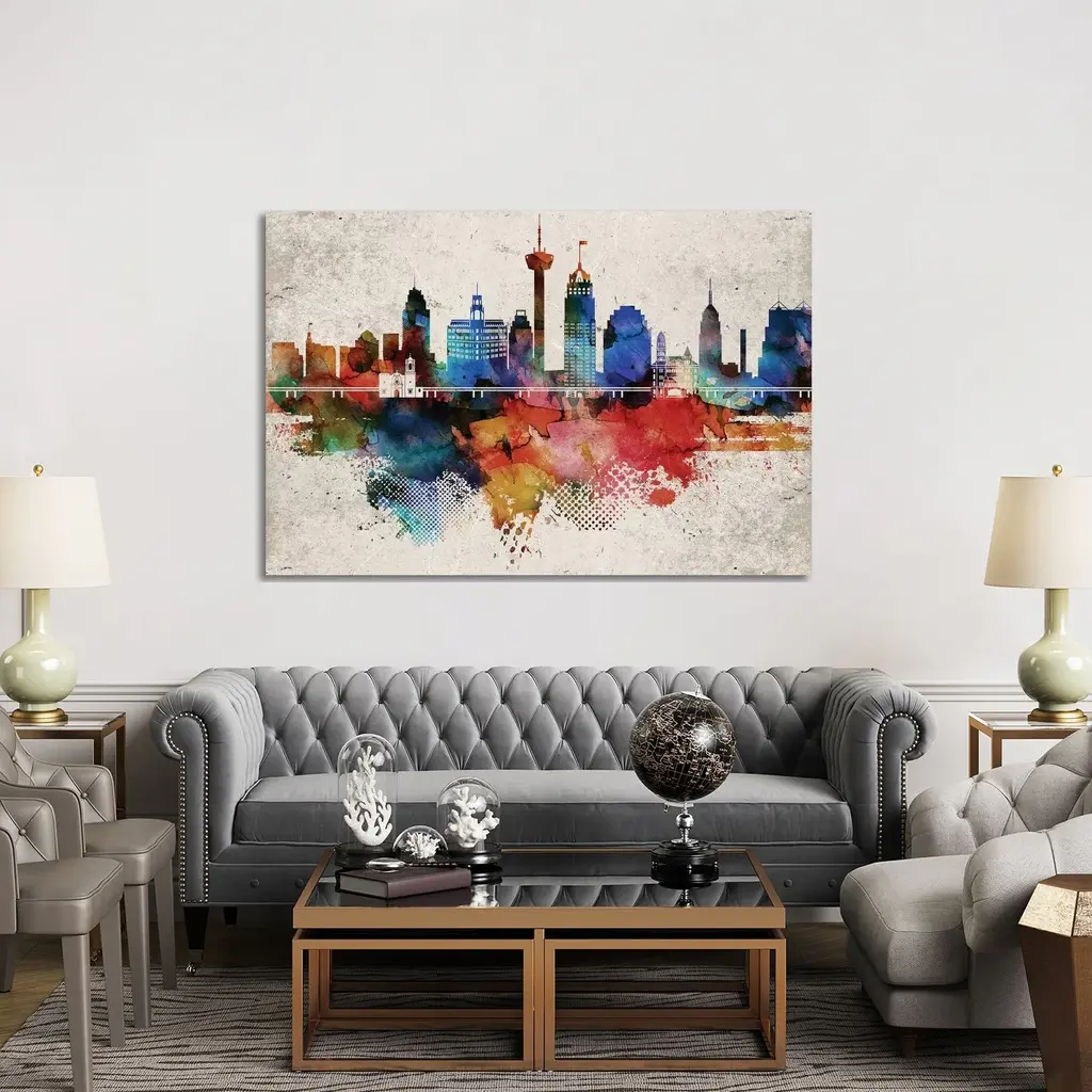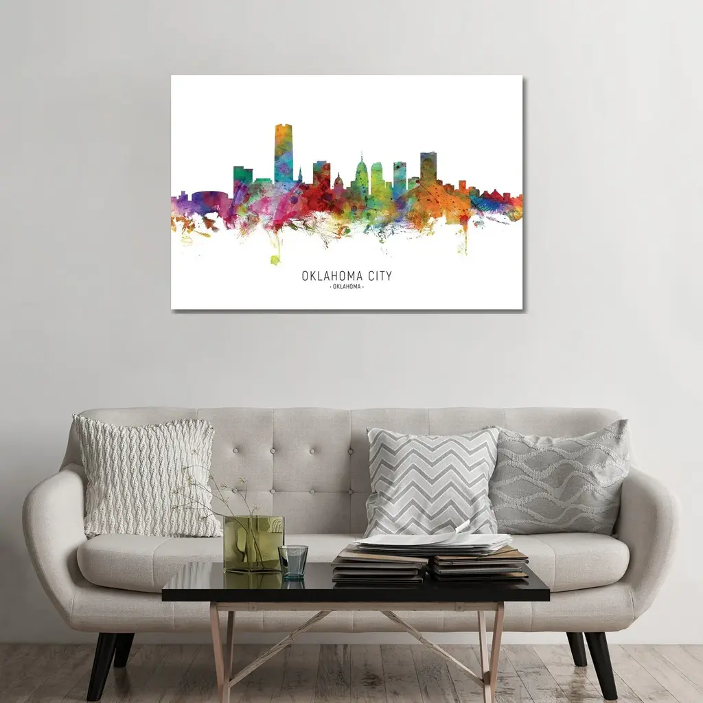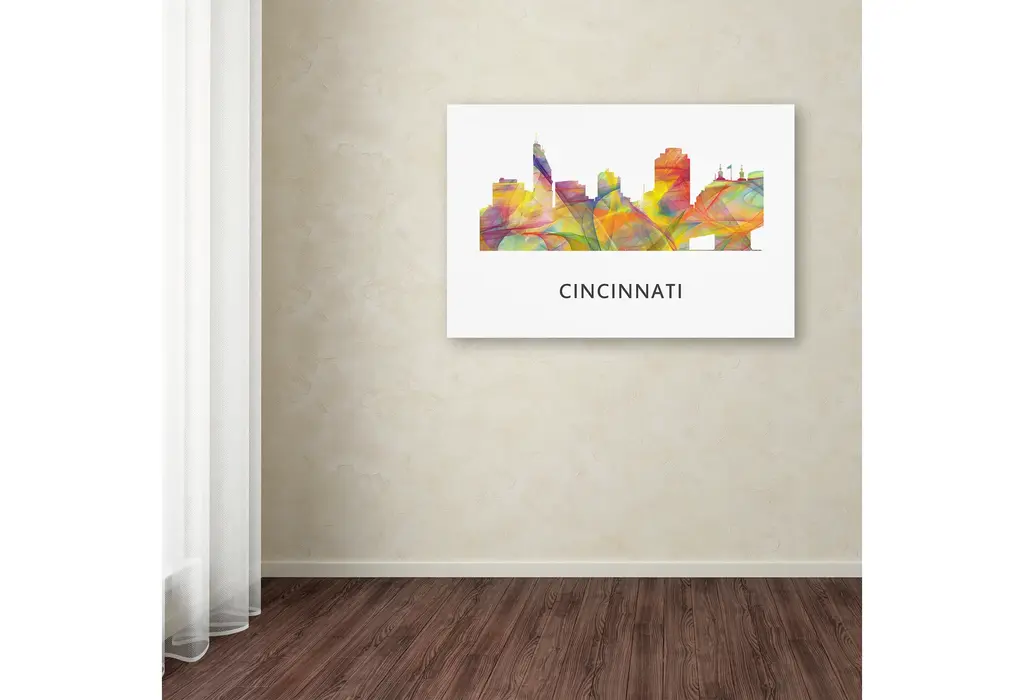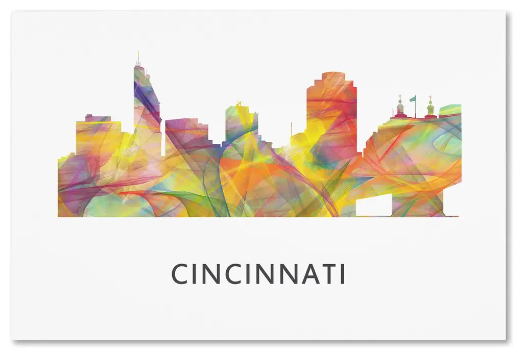 Artist: Marlene WatsonSubject: LandscapeStyle: ContemporaryProduct Type: Gallery-Wrapped Canvas ArtMade in USAThis ready to hang, gallery-wrapped art piece features a multicolored image of the Cincinnati, Ohio skyline.Born in Scotland and now residing in Hong Kong, Marlene Watson has been painting her way through life. She paints things she notices in everyday life and brings out her positive energy through her work. Marlene has gallery showings and has also illustrated a children's book. She cares for 12 cats and works toward animal conservation and rescues with her art.Giclee (jee-clay) is an advanced printmaking process for creating high quality fine art reproductions. The attainable excellence that Giclee printmaking affords makes the reproduction virtually indistinguishable from the original piece. The result is wide acceptance of Giclee by galleries, museums, and private collectors. Gallery wrap is a method of stretching an artist's canvas so that the canvas wraps around the sides and is secured a hidden, wooden frame. This method of stretching and preparing a canvas allows for a frameless presentation of the finished painting.