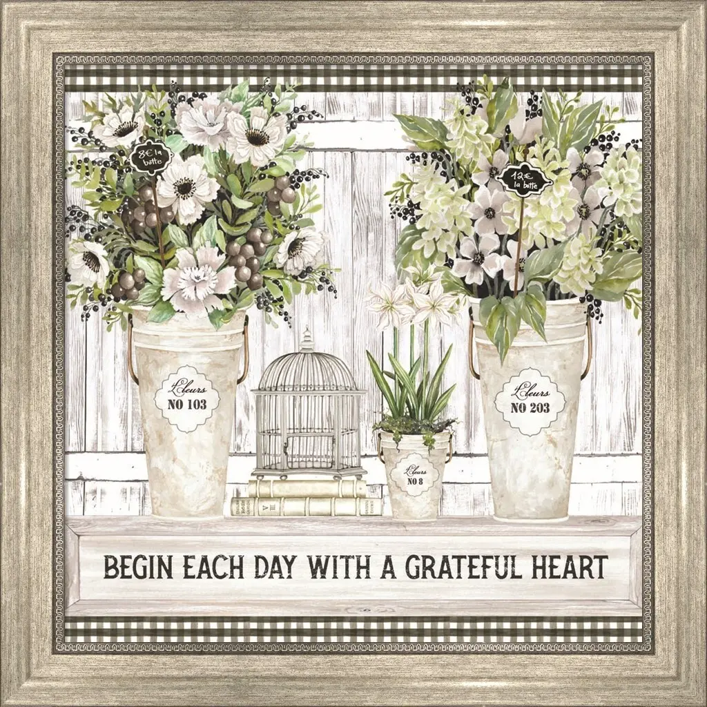 Begin Each day by Cindy Jacobs is a high quality piece of framed artwork. The finished size of this piece is 19" X 19". It has a Classic Champagne Silver with Ornate Inner Edge frame and is finished with high quality Acrylic Plexiglass. 100% Satisfaction Guaranteed.