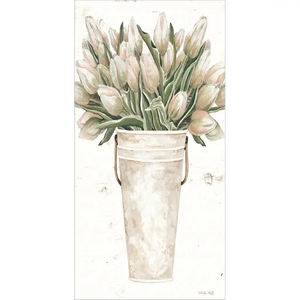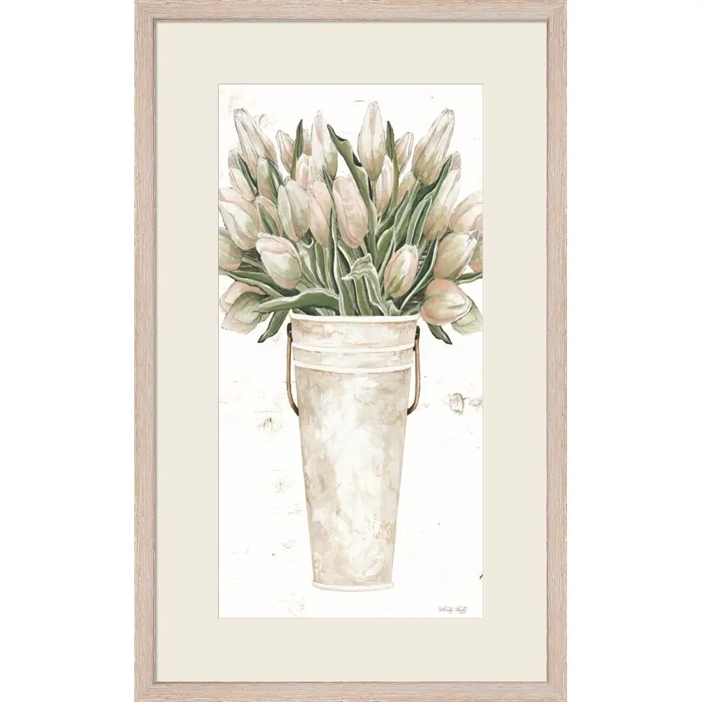 Blushing Tulips by Cindy Jacobs is a high quality piece of framed artwork. The finished size of this piece is 16" X 25.75". It has a Distressed Aged White Wash frame, is single matted and finished with high quality Acrylic Plexiglass. 100% Satisfaction Guaranteed.