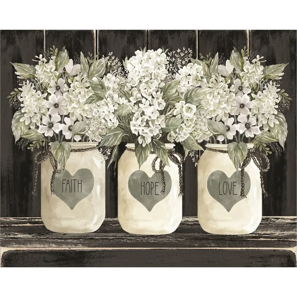 Faith, Hope, Love Crocks by Cindy Jacobs is a high quality piece of framed artwork. The finished size of this piece is 25.5" X 21". It has a Classic Champagne Silver with Ornate Inner Edge frame and is finished with high quality Acrylic Plexiglass. 100% Satisfaction Guaranteed.