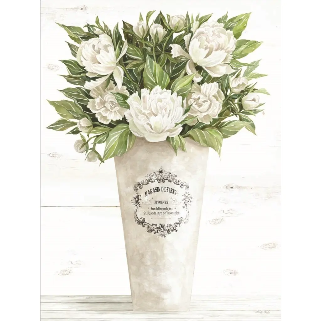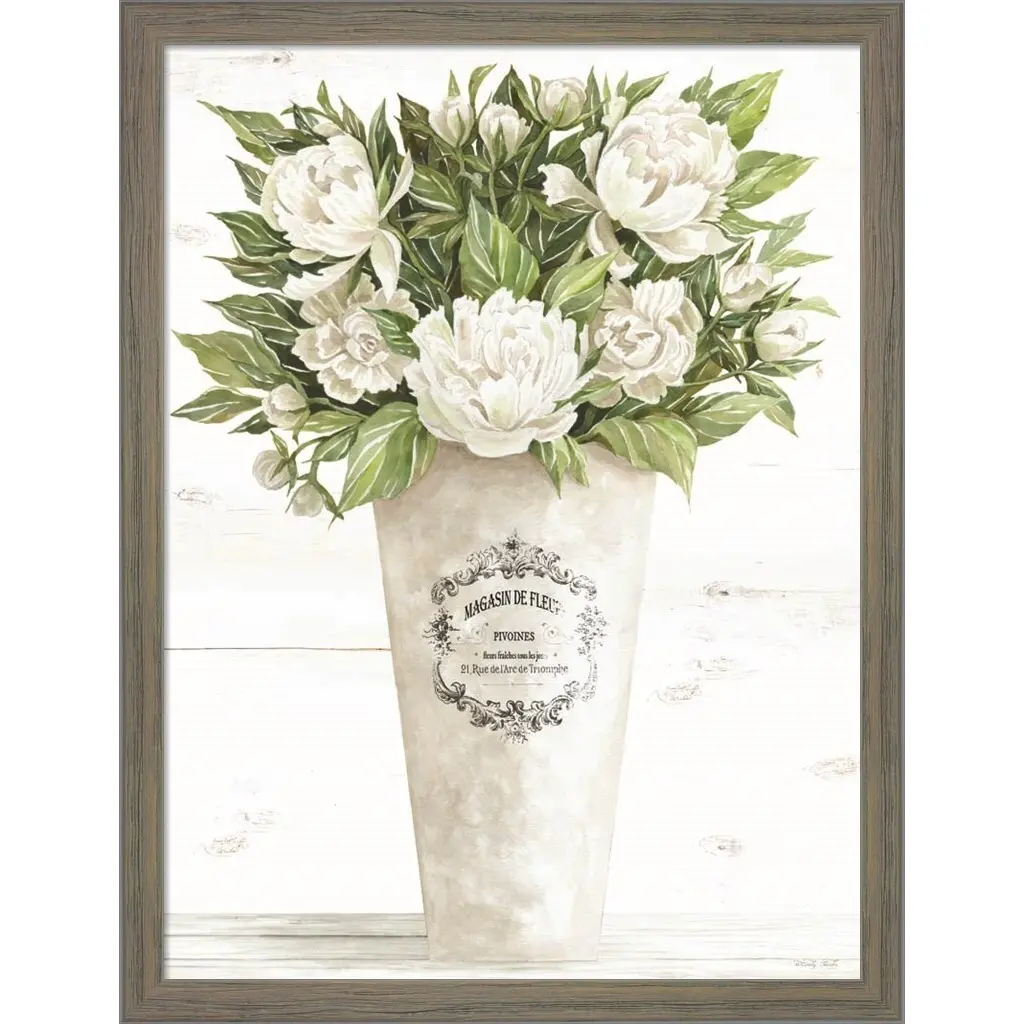 Les Fleurs Pivoines by Cindy Jacobs is a high quality piece of framed artwork. The finished size of this piece is 13" X 17". It has a Distressed Grey Knotty Wood frame and is finished with high quality Acrylic Plexiglass. 100% Satisfaction Guaranteed.