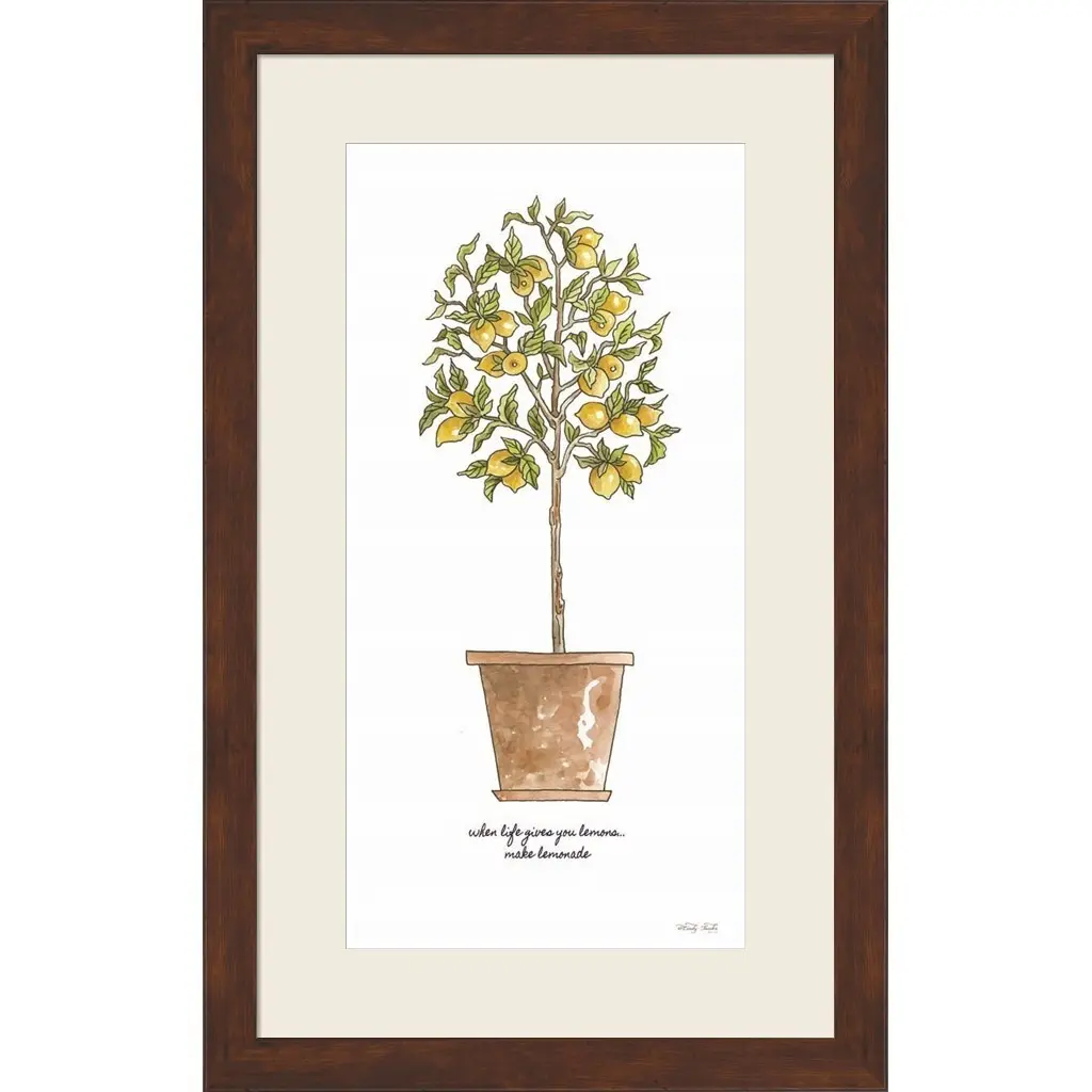 Life and Lemons by Cindy Jacobs is a high quality piece of framed artwork. The finished size of this piece is 16.75" X 26.5". It has a Slim Solid Pecan Brown Flat with Satin Finish frame, is single matted and finished with high quality Acrylic Plexiglass. 100% Satisfaction Guaranteed.