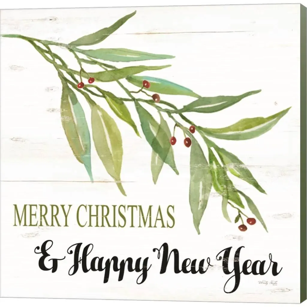 Merry Christmas and Happy New Year by Cindy Jacobs is a high quality piece of canvas artwork. The finished size of this piece is 12" X 12", and it has a depth 1.5" with sagegreen painted sides. There is a UV protective coating over the entire image, and it is ready to hang on your wall with no hardware required. 100% Satisfaction Guaranteed.