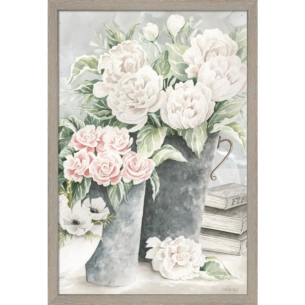 Plentiful Blooms I by Cindy Jacobs is a high quality piece of framed artwork. The finished size of this piece is 14.5" X 21". It has a Distressed Aged White Wash frame and is finished with high quality Acrylic Plexiglass. 100% Satisfaction Guaranteed.