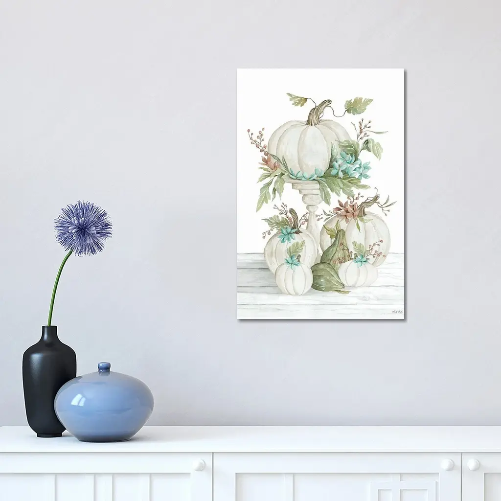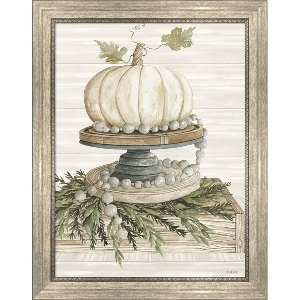 White Pumpkin on Display by Cindy Jacobs is a high quality piece of framed artwork. The finished size of this piece is 18" X 23". It has a Classic Champagne Silver with Ornate Inner Edge frame and is finished with high quality Acrylic Plexiglass. 100% Satisfaction Guaranteed.