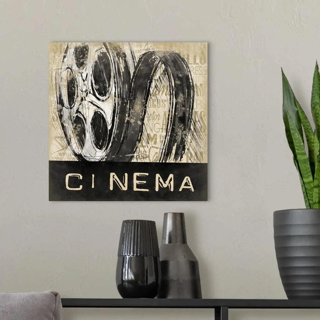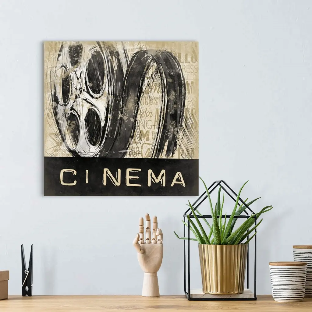 Contemporary artwork with sketch stylized film reel against a text background. The word "Cinema " at the bottom of the image.