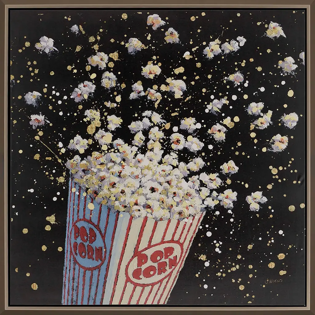 A canvas of exploding popcorn is perfect for movie night. Giclee on canvas is wrapped around wood stretcher bars. Mounted in a champagne gold finish floater frame.