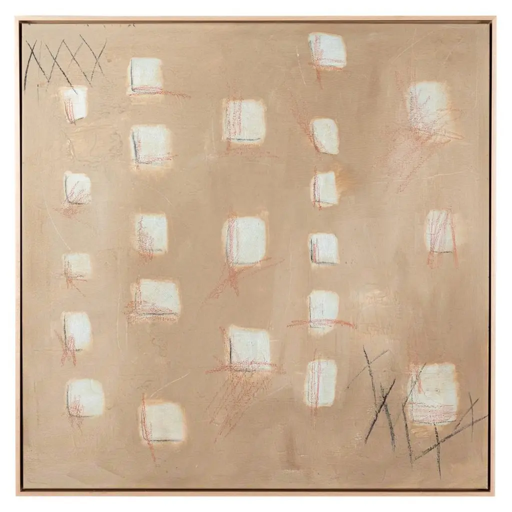 In this abstract wall art piece, artist Jamie Beckwith evokes a playful balance with a loose motif of marks and shapes. Her mixed media style features acrylic and graphite, building a richly layered work for an inspired art wall decor.