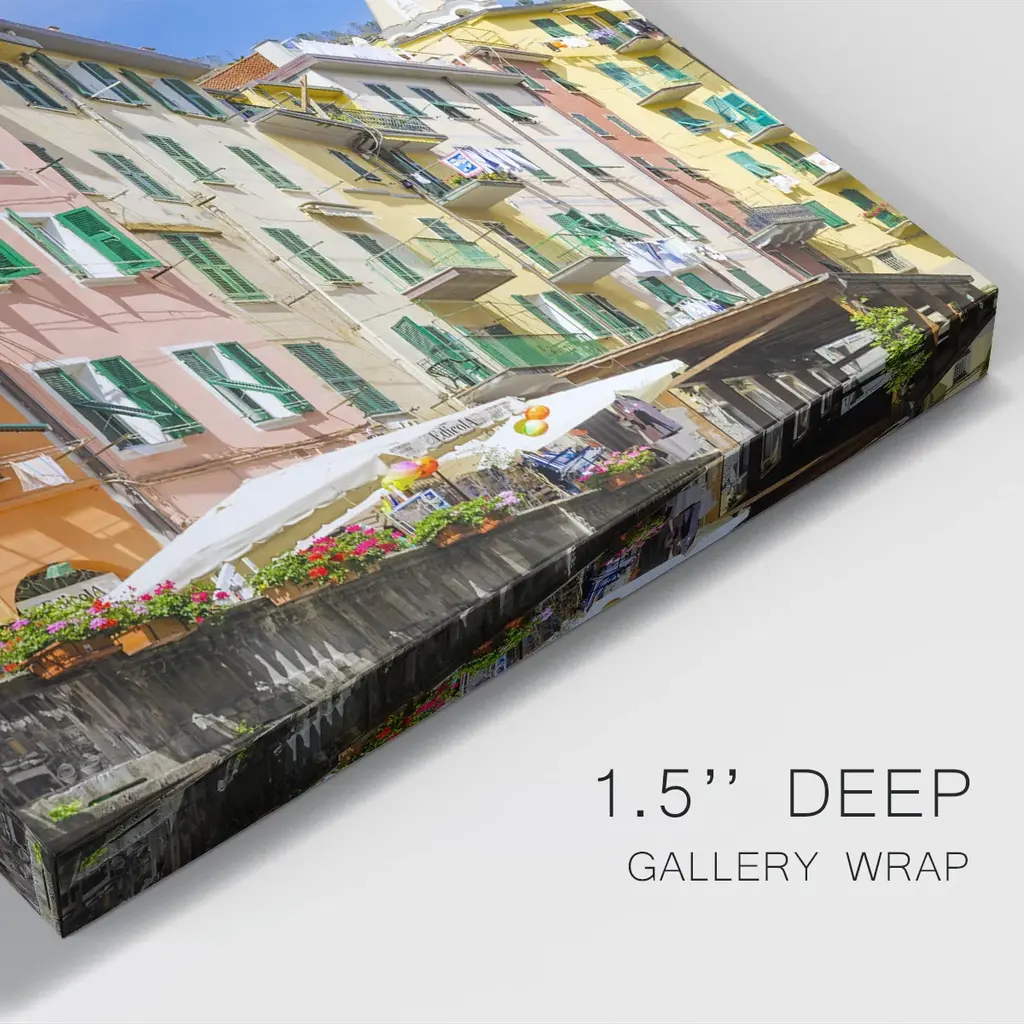 Cinque Terre Premium Gallery Wrapped Canvas - Ready to Hang A premium hand stretched gallery wrapped canvas print created to last. Featuring a beveled a solid wood stretcher bar, each piece comes ready to hand 6 SIZES AVAILABLE 8''X12'' - Overall Size 12''X18'' - Overall Size 18''X27'' - Overall Size 24''x36'' - Overall Size 32''x48'' - Overall Size 40''x60'' - Overall Size Each piece is made to order. Built to Last Each piece comes ready to hang Solid wood stretcher Fade and Water resistant Made domestically