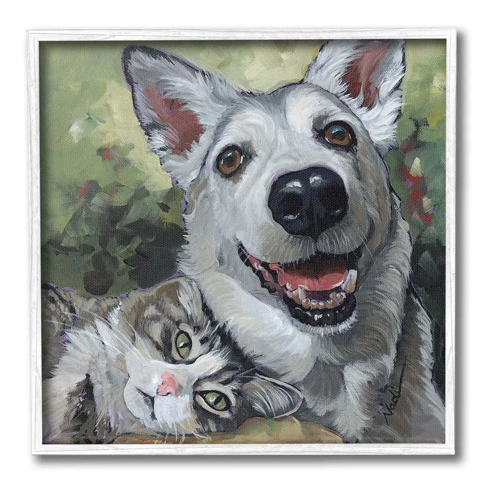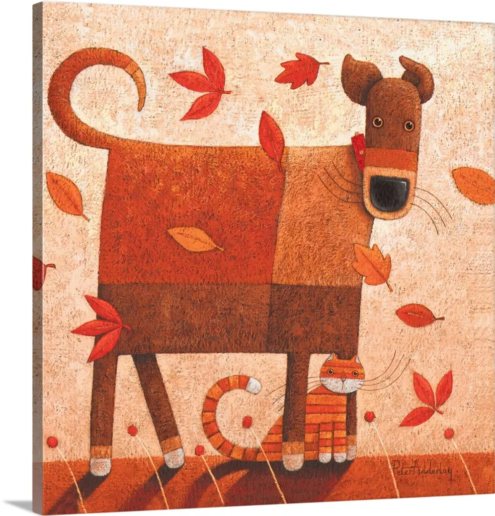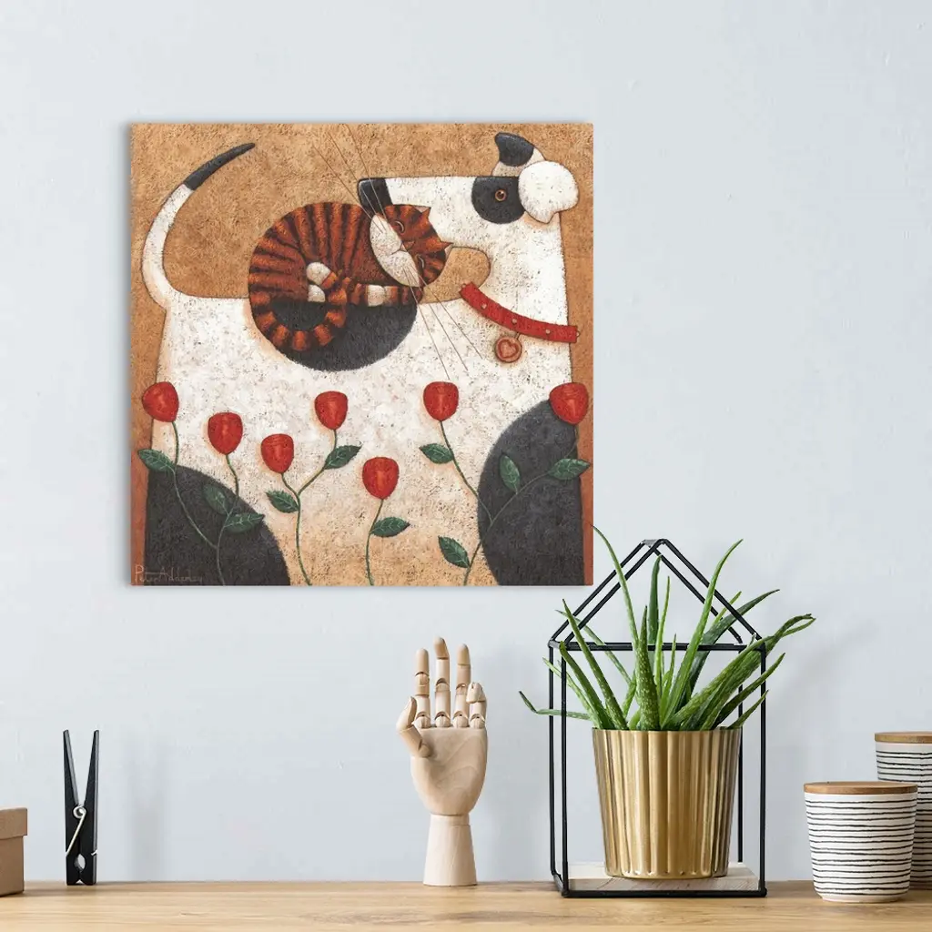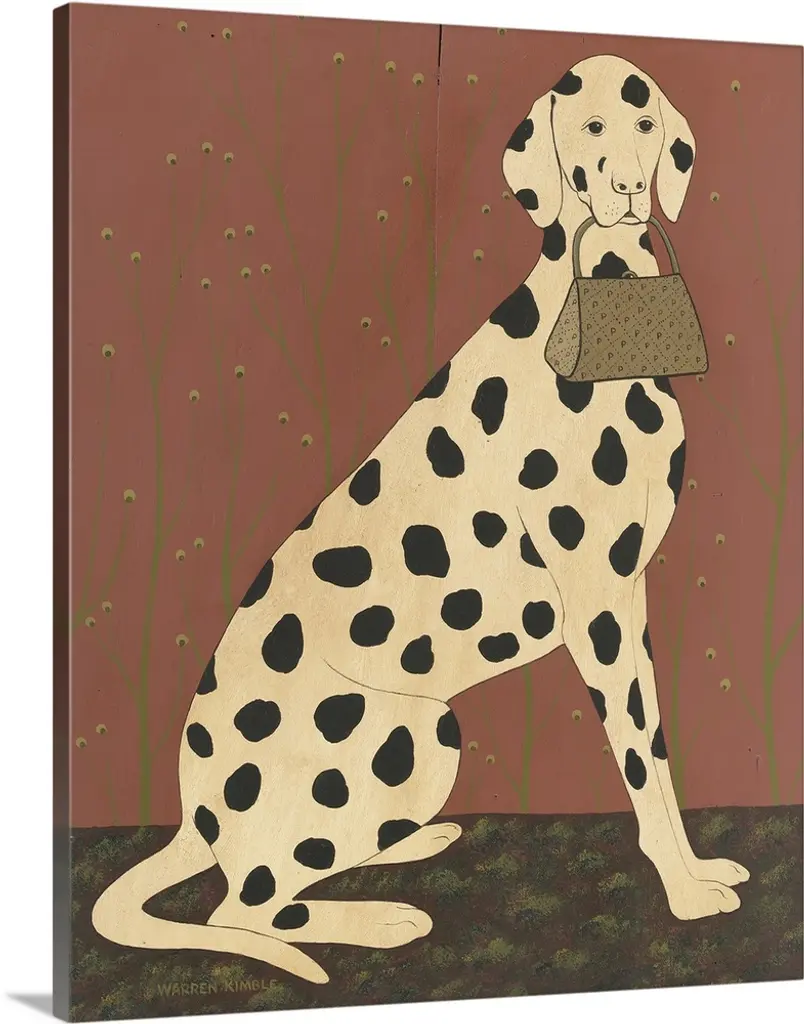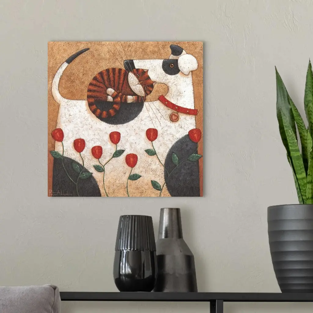 Contemporary painting of a dog with big black spots, with an orange striped cat sleeping on the dogs back.