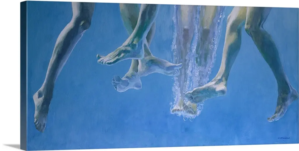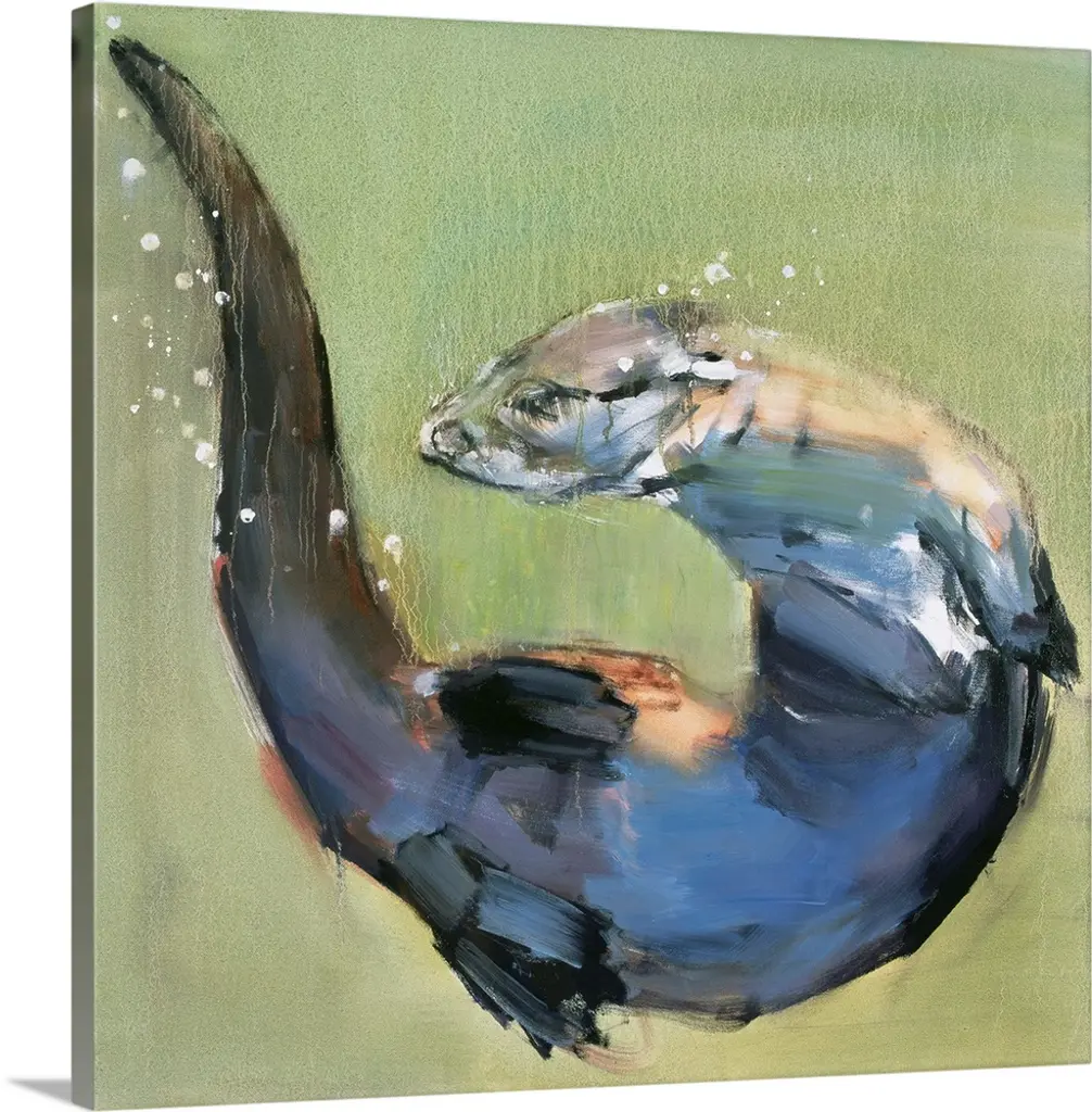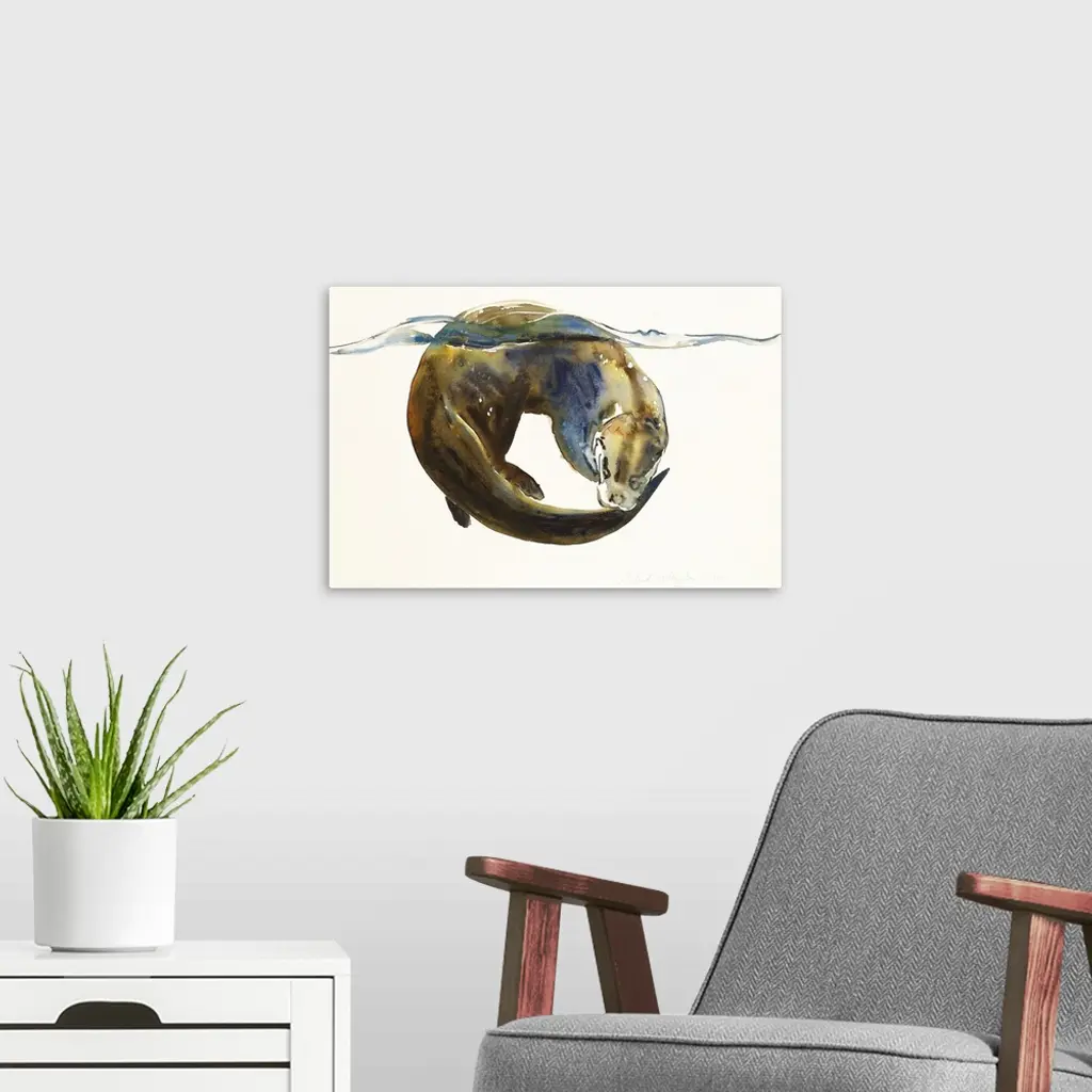 Contemporary artwork of a sea otter from under water, with its back breaching the surface.