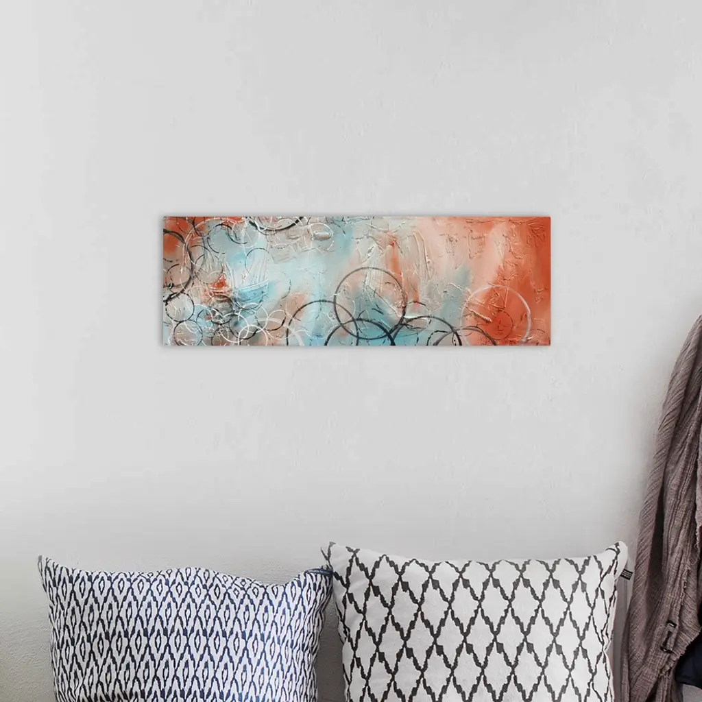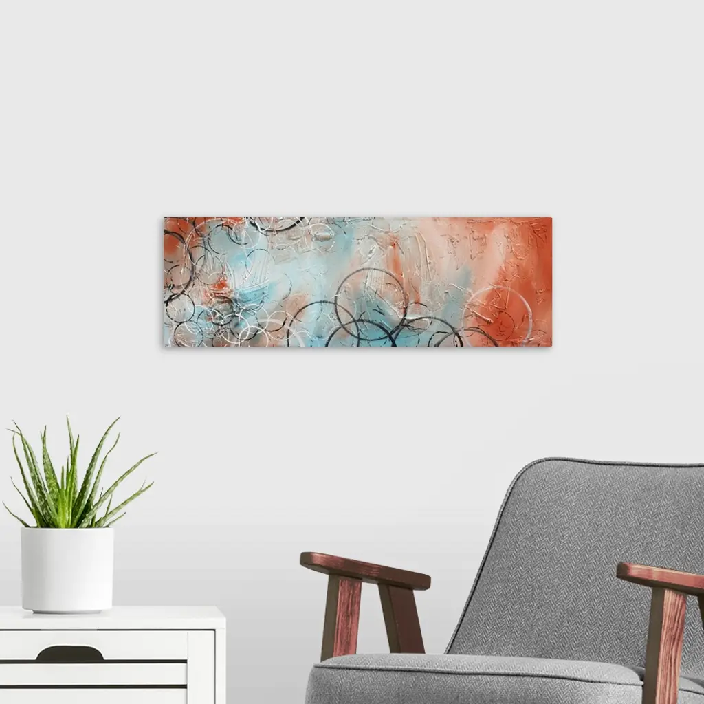 Trendy cool tones of light aqua and teal flow into shades of soft peach and bright rust. ?This is an original and contemporary heavily textured abstract painting that will bring fun and color into any home decor or design. The black and white circles in the foreground add depth and contrast . ?�