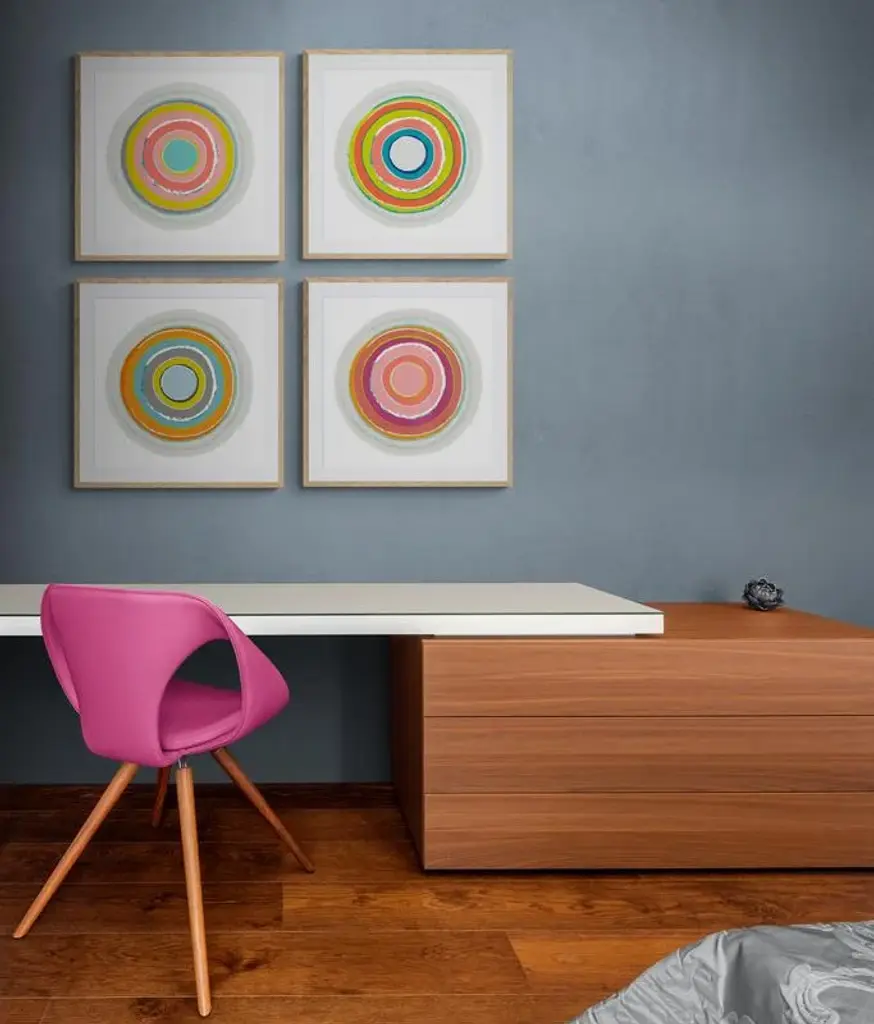 This colorful, mid century inspired fine art print is digitally printed on premium white matte paper. While sold individually, coordinating prints by Melinda Cox, Creative Director of Balanced Design Studio, are available in additional colorways to combine as pairs or groupings of bold color. The print "Quartet in Yellow and Pink" was designed as a companion to this piece. Using the highest quality printing available, these prints have superb color saturation. Made to order, the prints are shipped unframed in a tube and are available in four sizes. Each print is hand signed by Melinda Cox. About the artist: Melinda Cox is the Creative Director of Balanced Design: Modern Patterns / Traditional Craftsmanship/ Made in the USA fabrics, rugs and fine art prints. An artist at the intersection of minimalism and graphic pattern, her work can be seen in both commercial projects and private residences throughout the USA and has appeared in numerous national and international publications. Her fine art prints are represented by Candita Clayton Gallery. Artist Statement: I see the world in simple shapes and powerful colors. I see patterns. Whether as a print designer, a graphic designer, a textile designer, or a rug designer, I take a minimalist approach to using color, shape and form. My work has been called daring, bold, whimsical and happy, and is inspired by any simple shape, like a bird’s foot imprinted in the sand.
