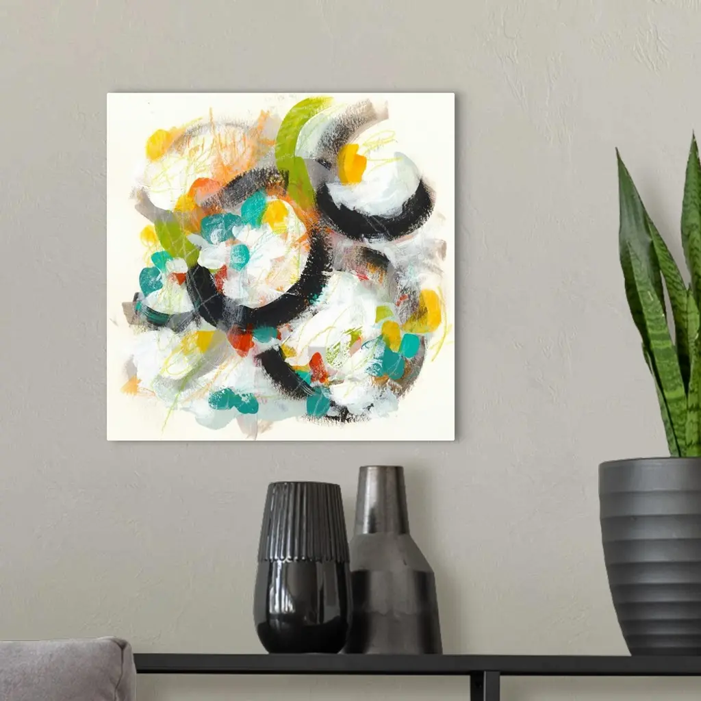 Contemporary abstract painting using vibrant colors and circular shapes.