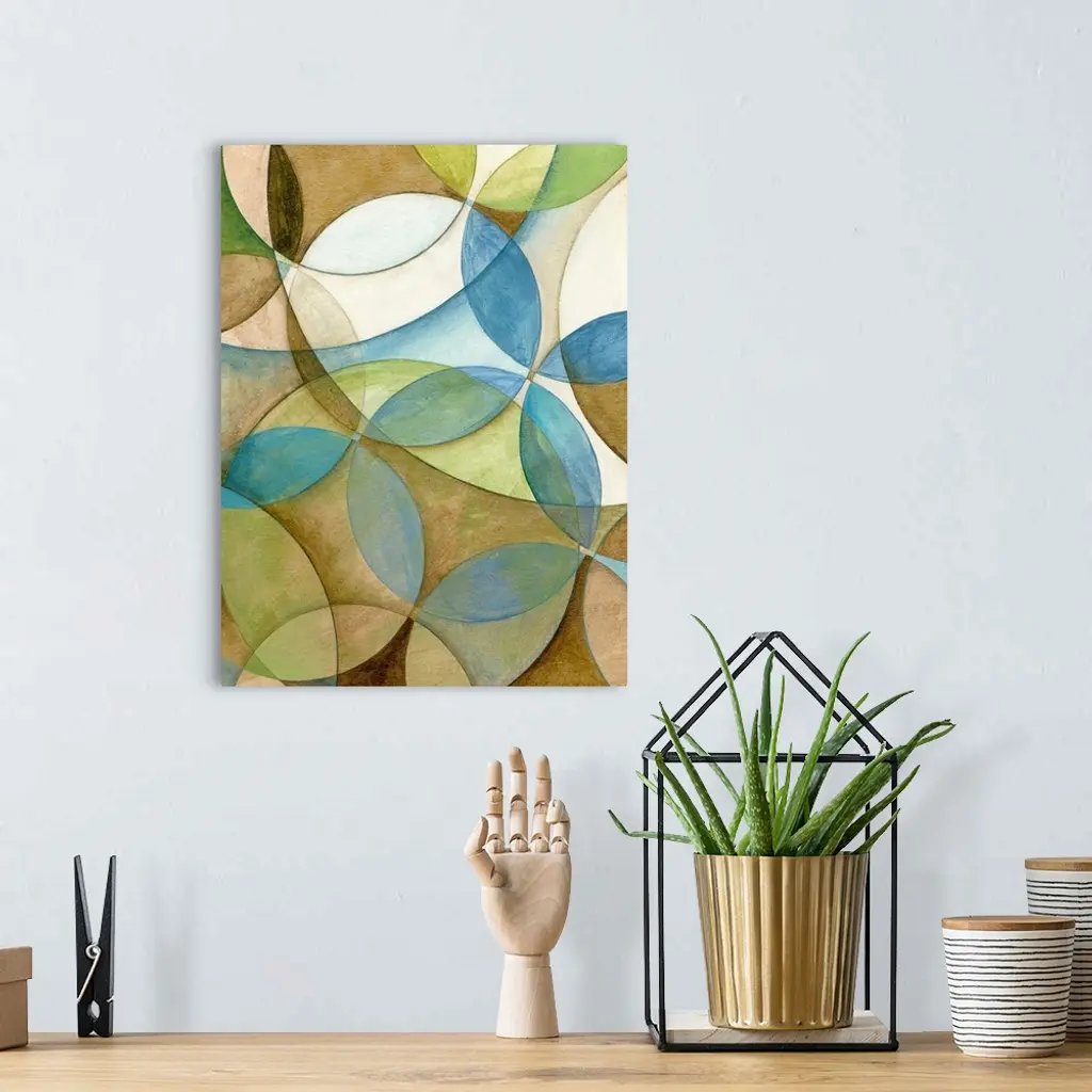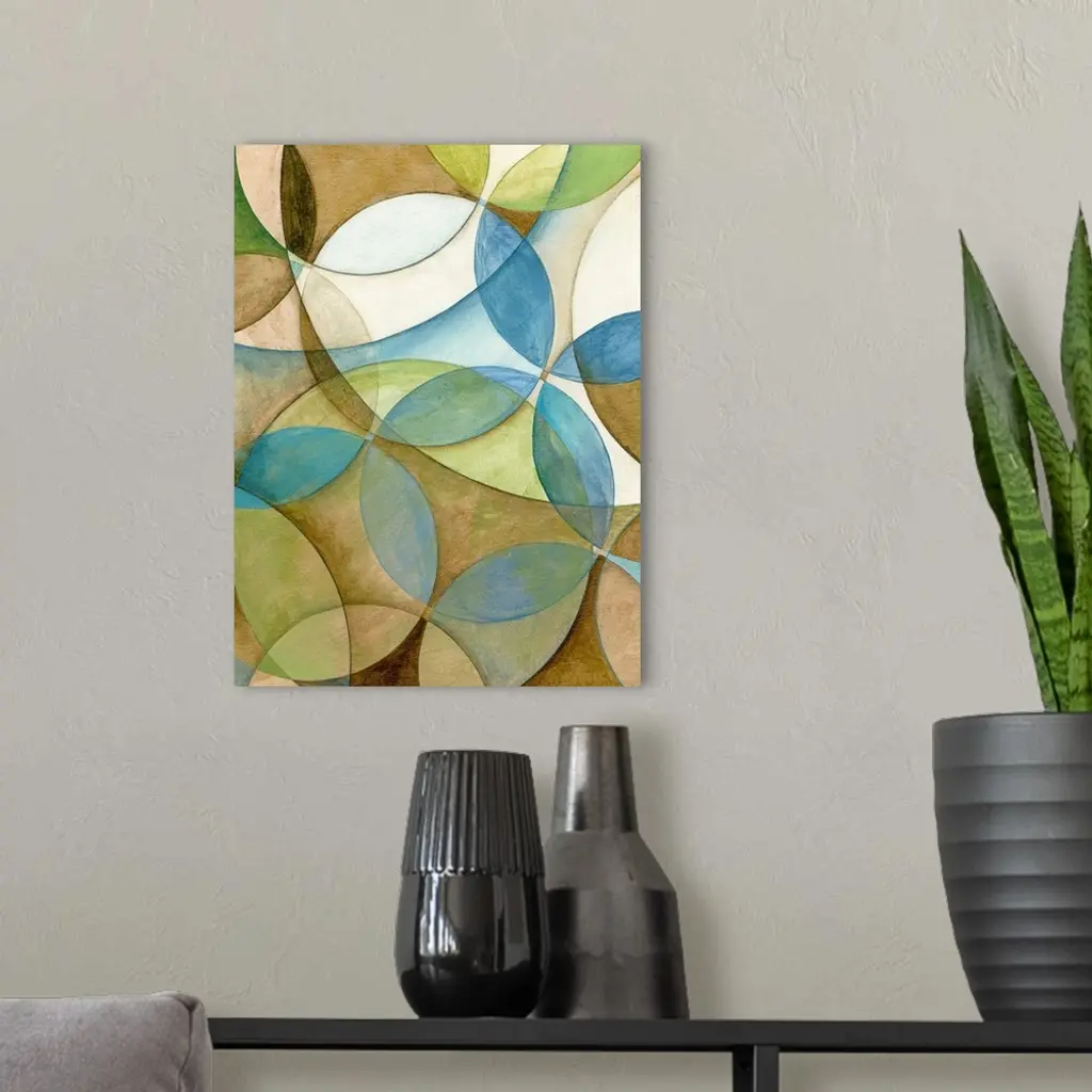 Abstract artwork that has various circles of different sizes laid over each other that creates a floral like design.