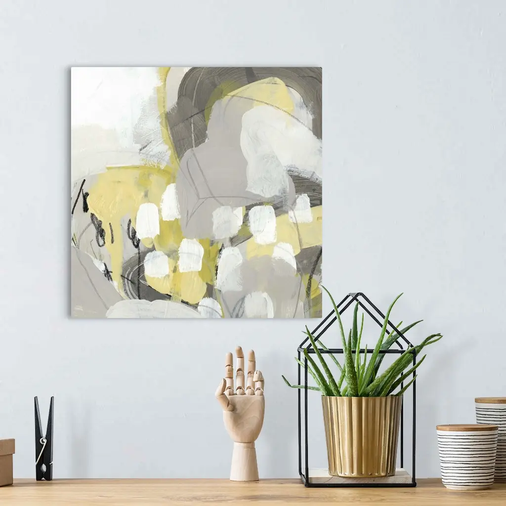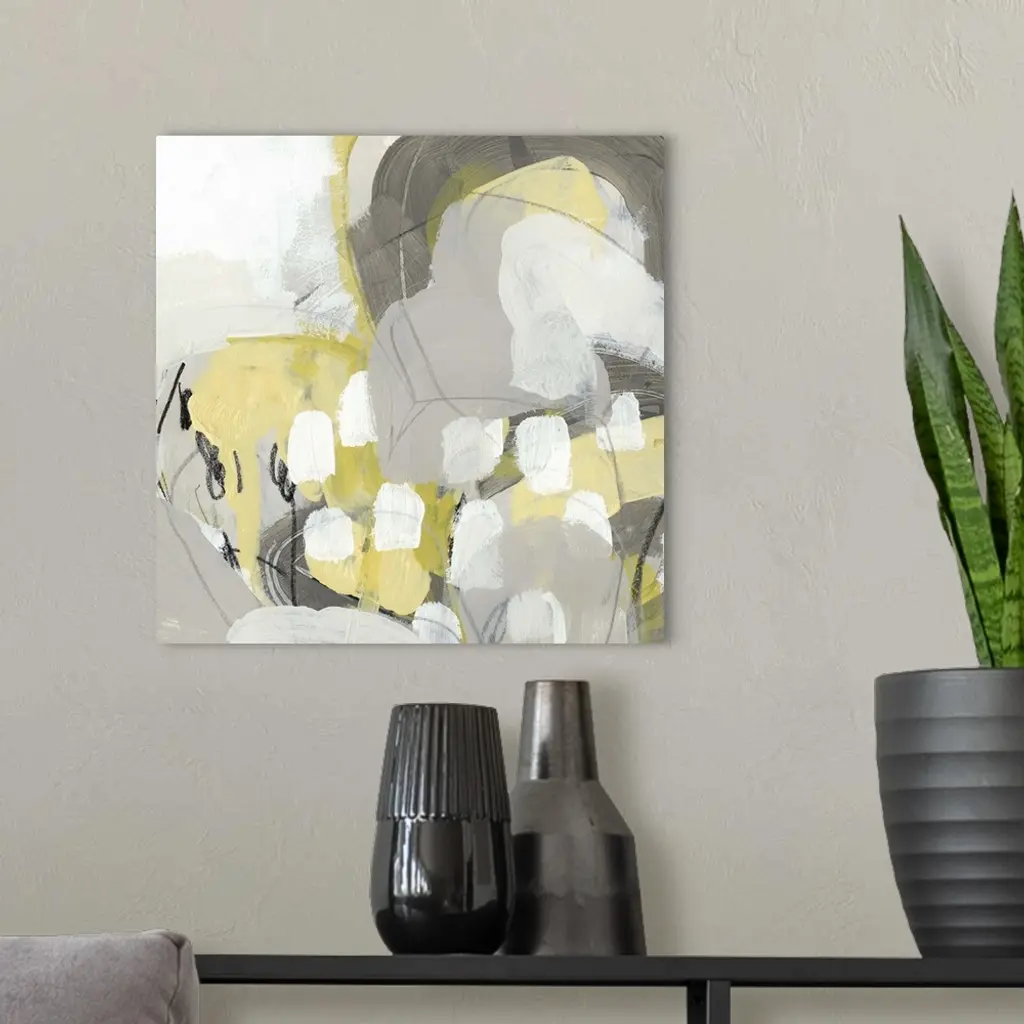 Square abstract painting in yellow, gray and white in overlapping circular shapes with fine scribble lines of gray and black.