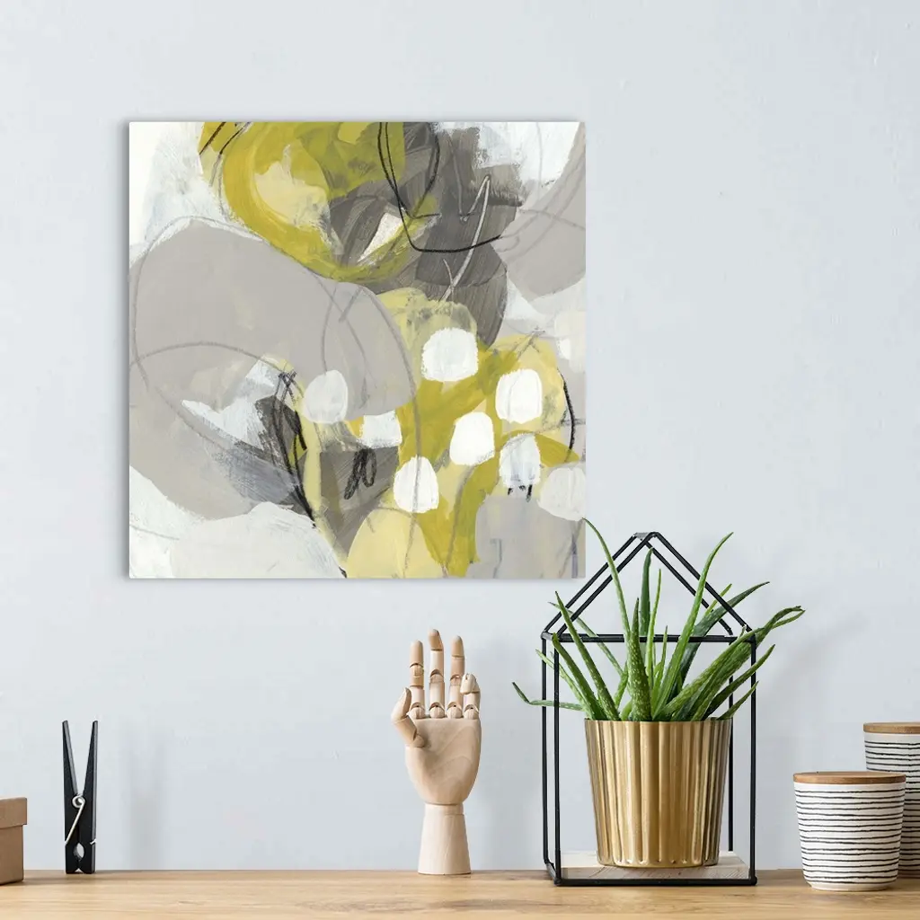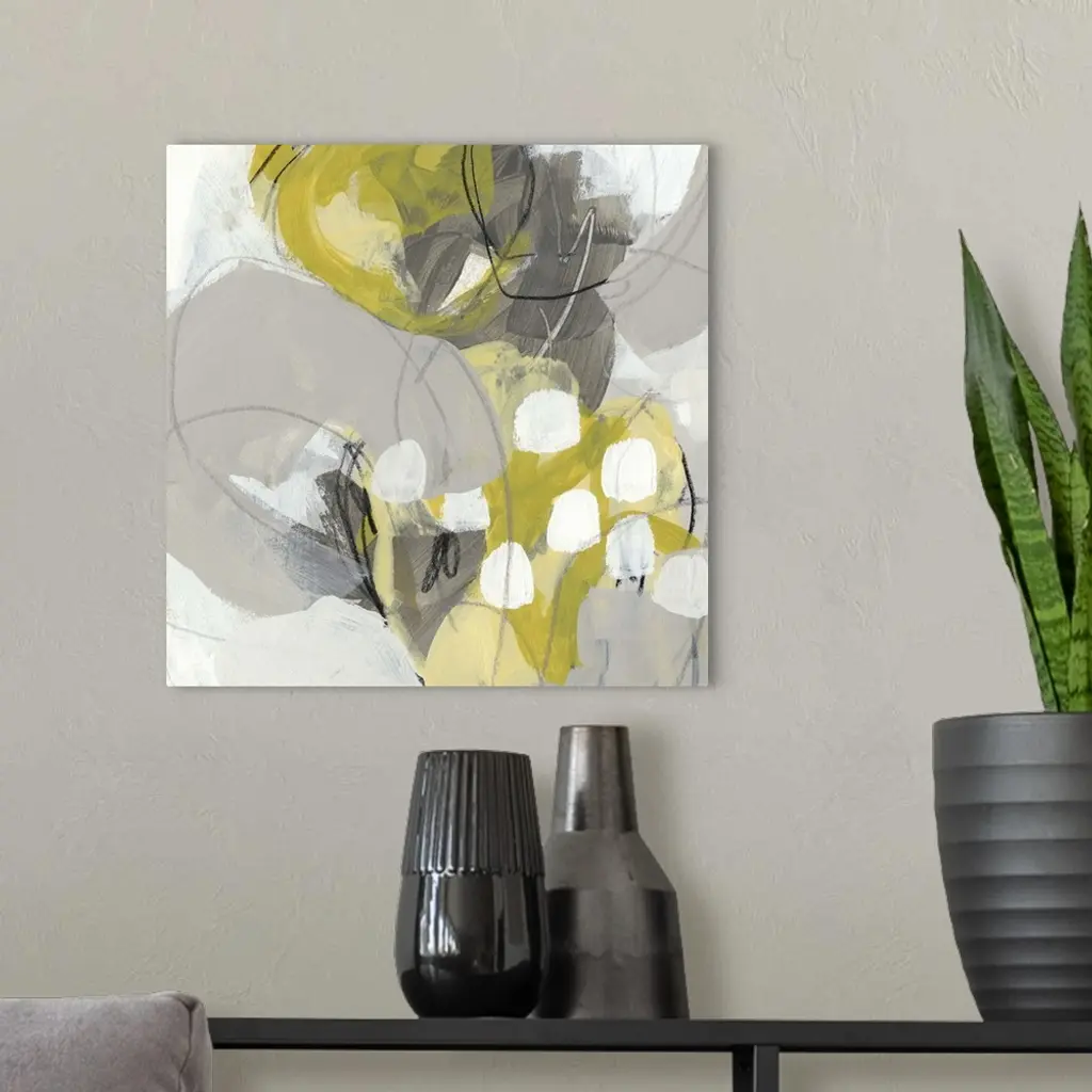 Square abstract painting in yellow, gray and white in overlapping circular shapes with fine scribble lines of gray and black.