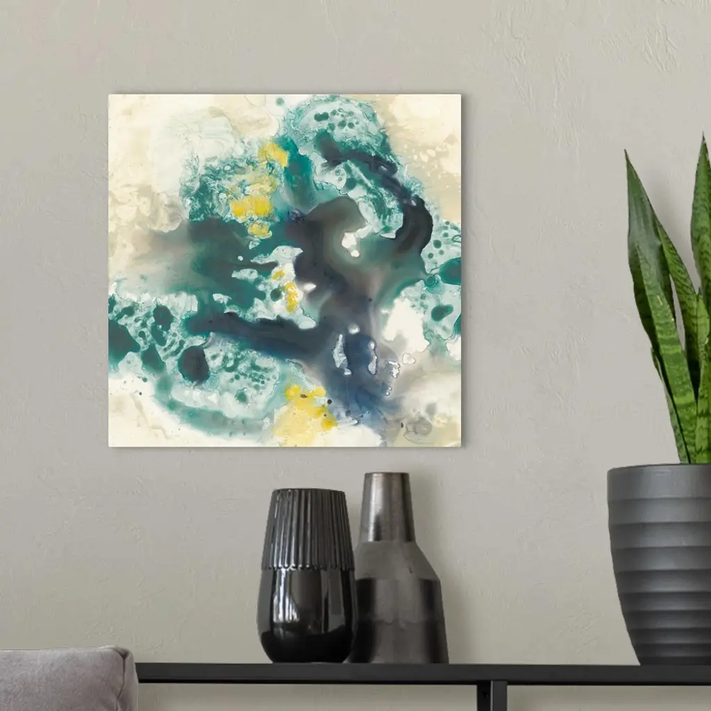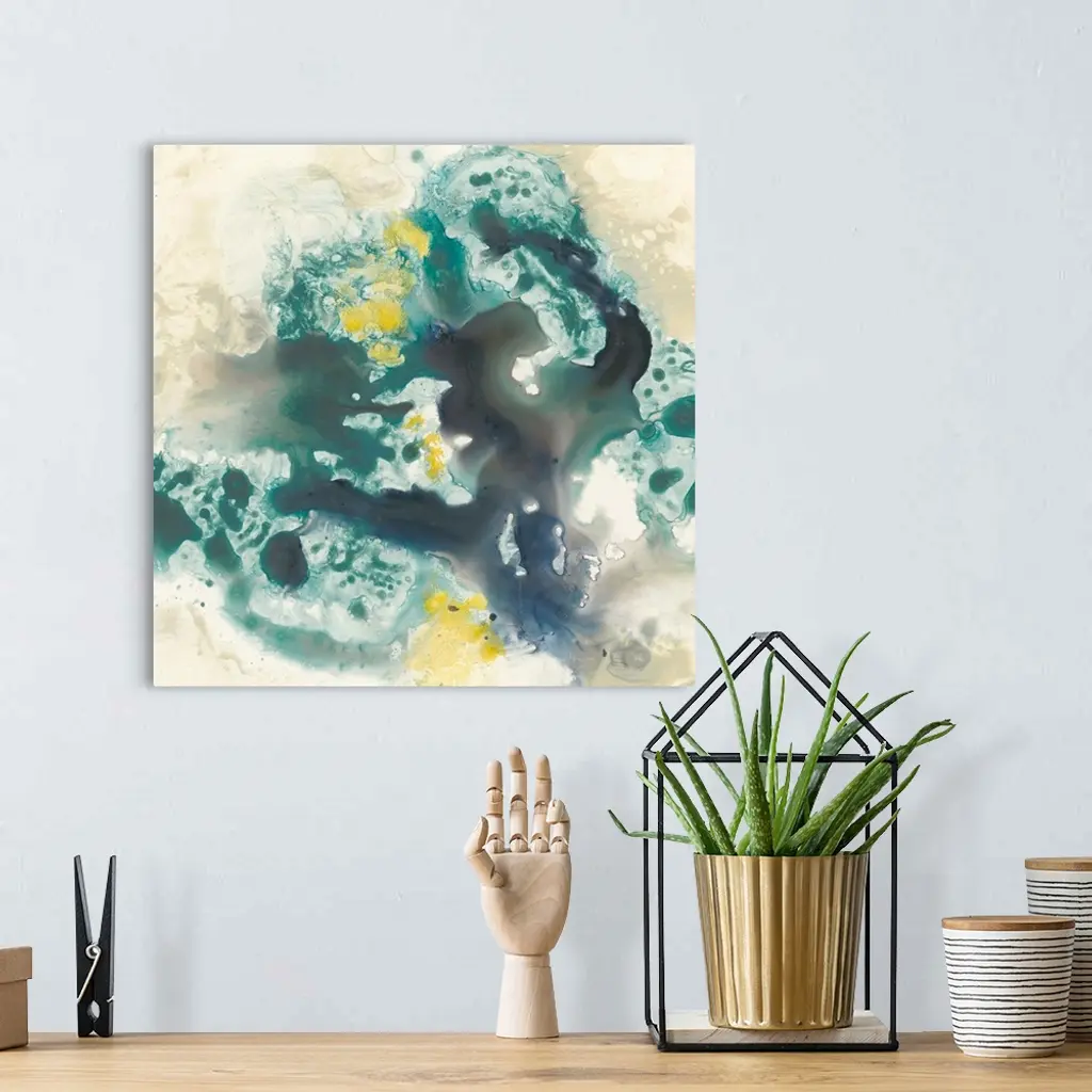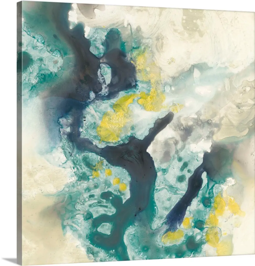 Abstract artwork of fluid paint in shades of green, blue and yellow glide against a khaki color over a white background.