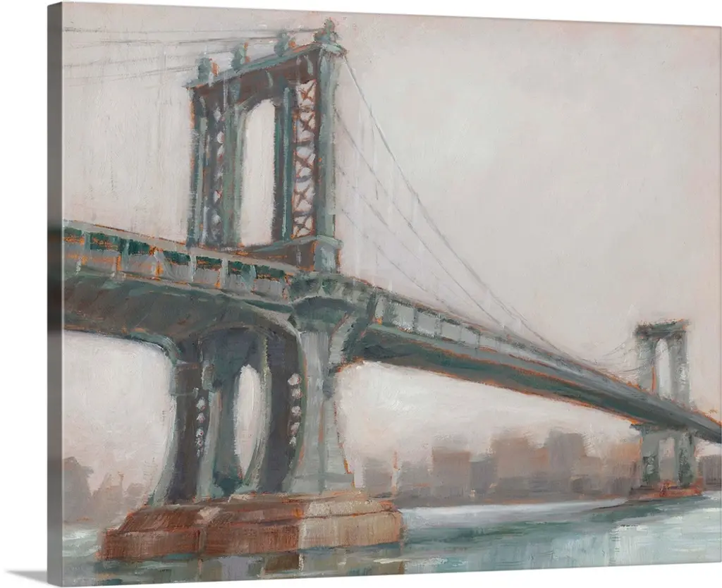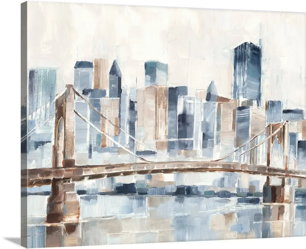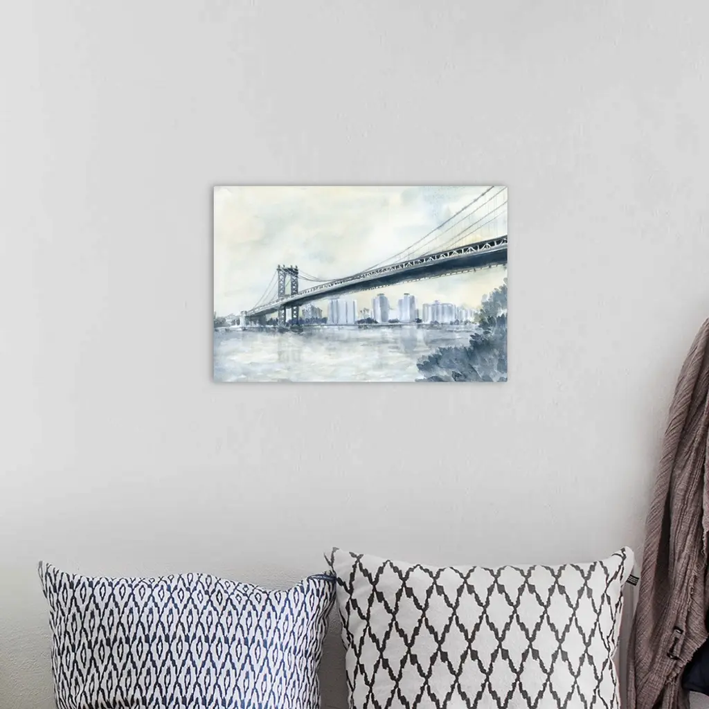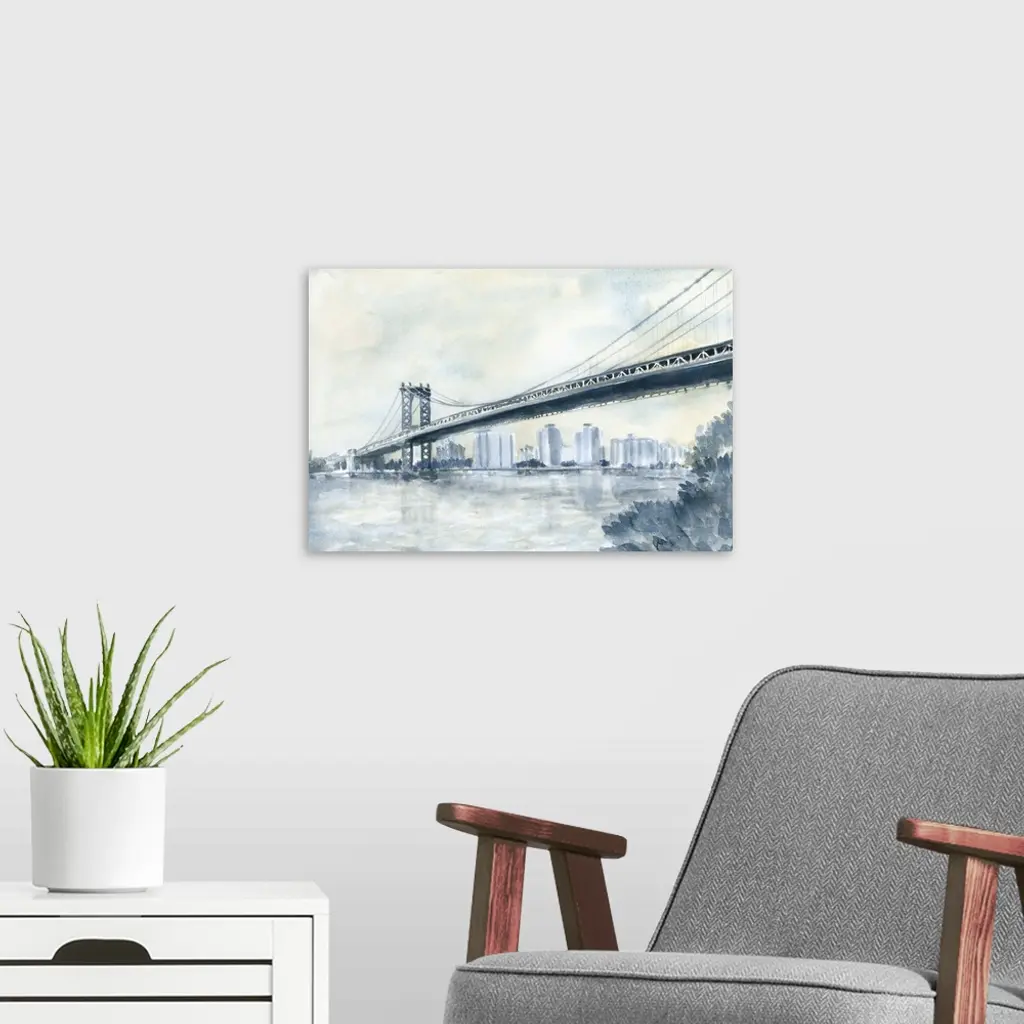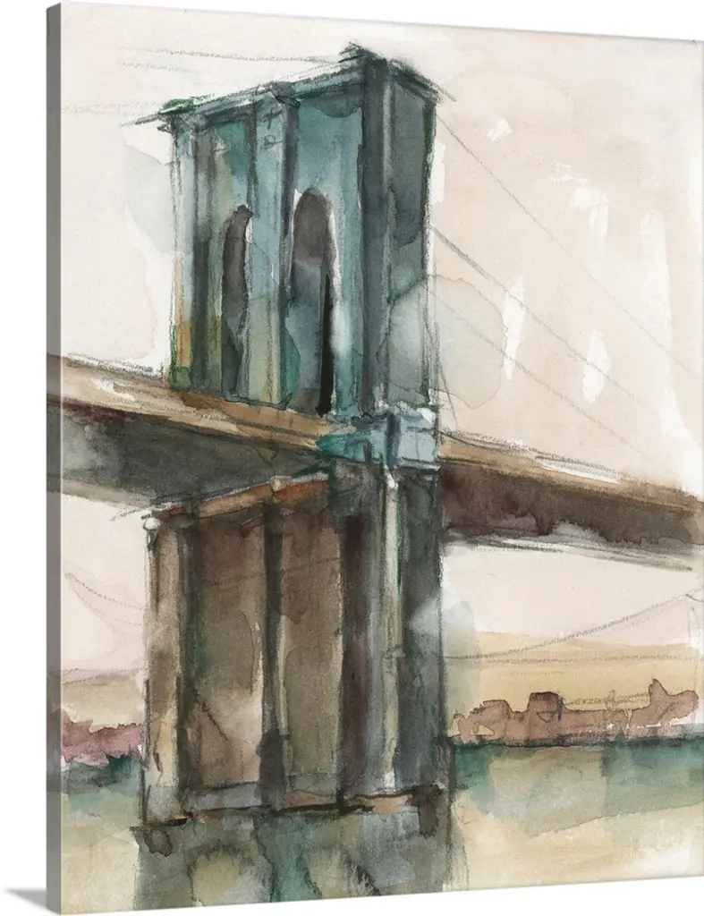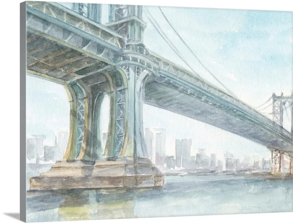 Contemporary watercolor painting of an urban bridge spanning a river, with a city skyline in the distance.