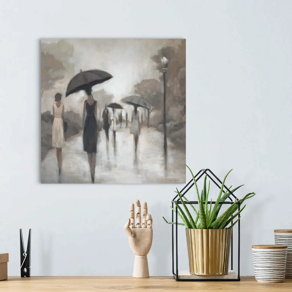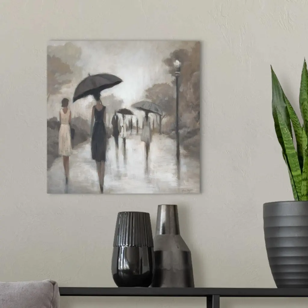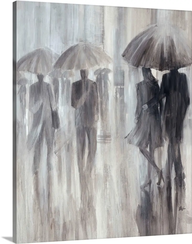 Contemporary painting of elongated figures walking through the rain under umbrellas.
