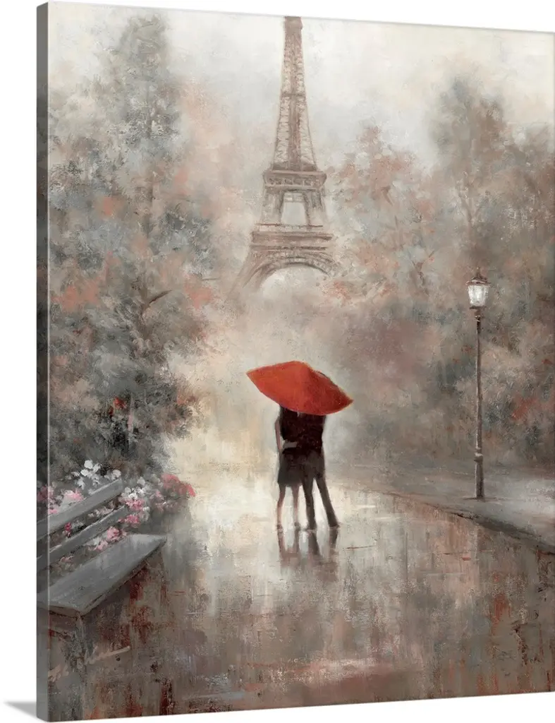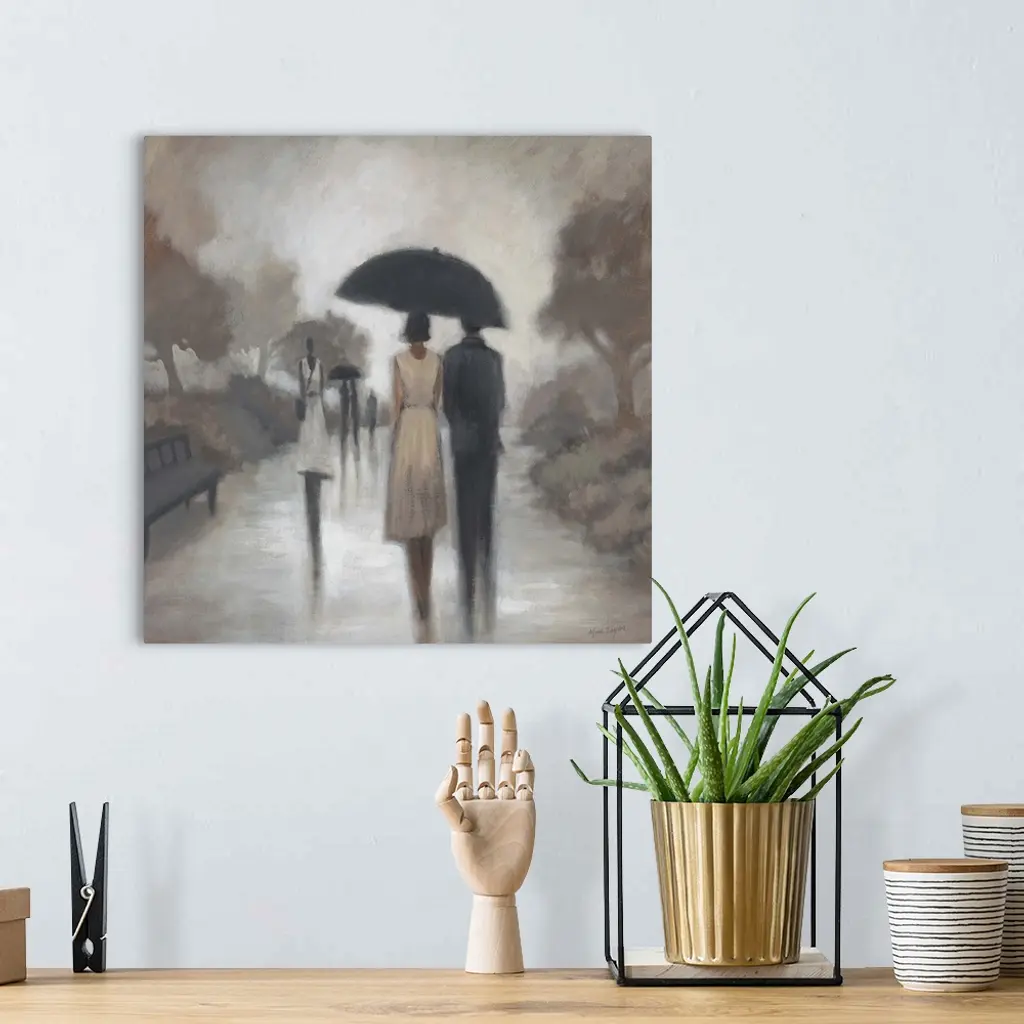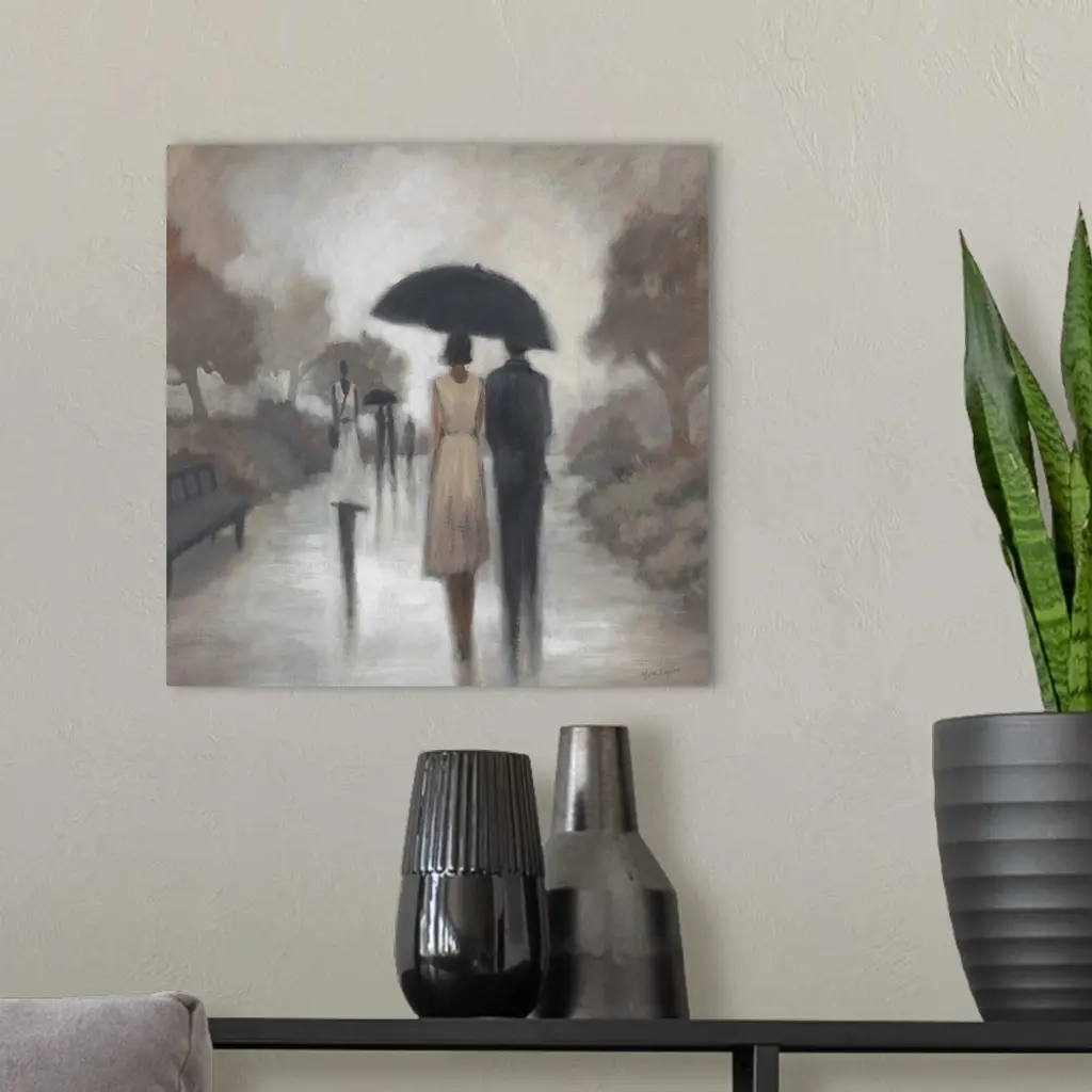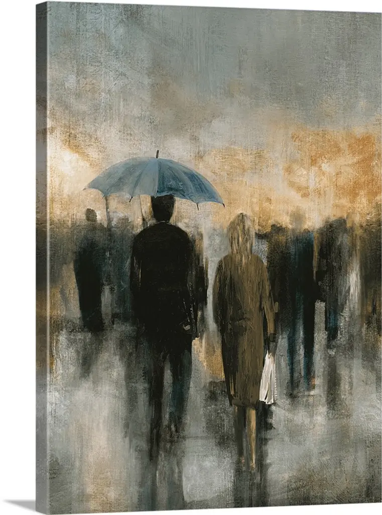Contemporary painting of elongated figures walking through the rain under umbrellas.