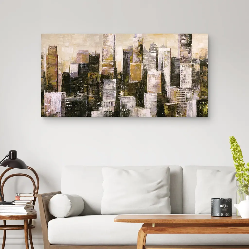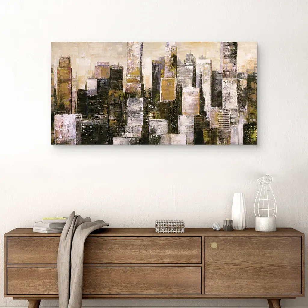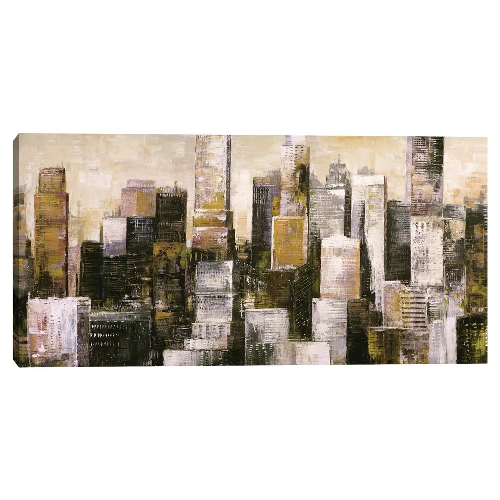 Sandy Doonan presents an overcrowded city of Monolithic geometric structures of inconsistent size crowded in a finite amount of space in her canvas art print City Gold I. Imagine the sheer volume of people living and working in all of those stacked buildings! This thought-provoking cityscape comes with all of the hardware for hanging in your cherished space.