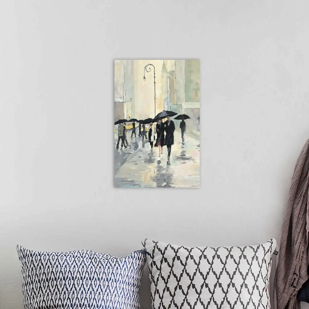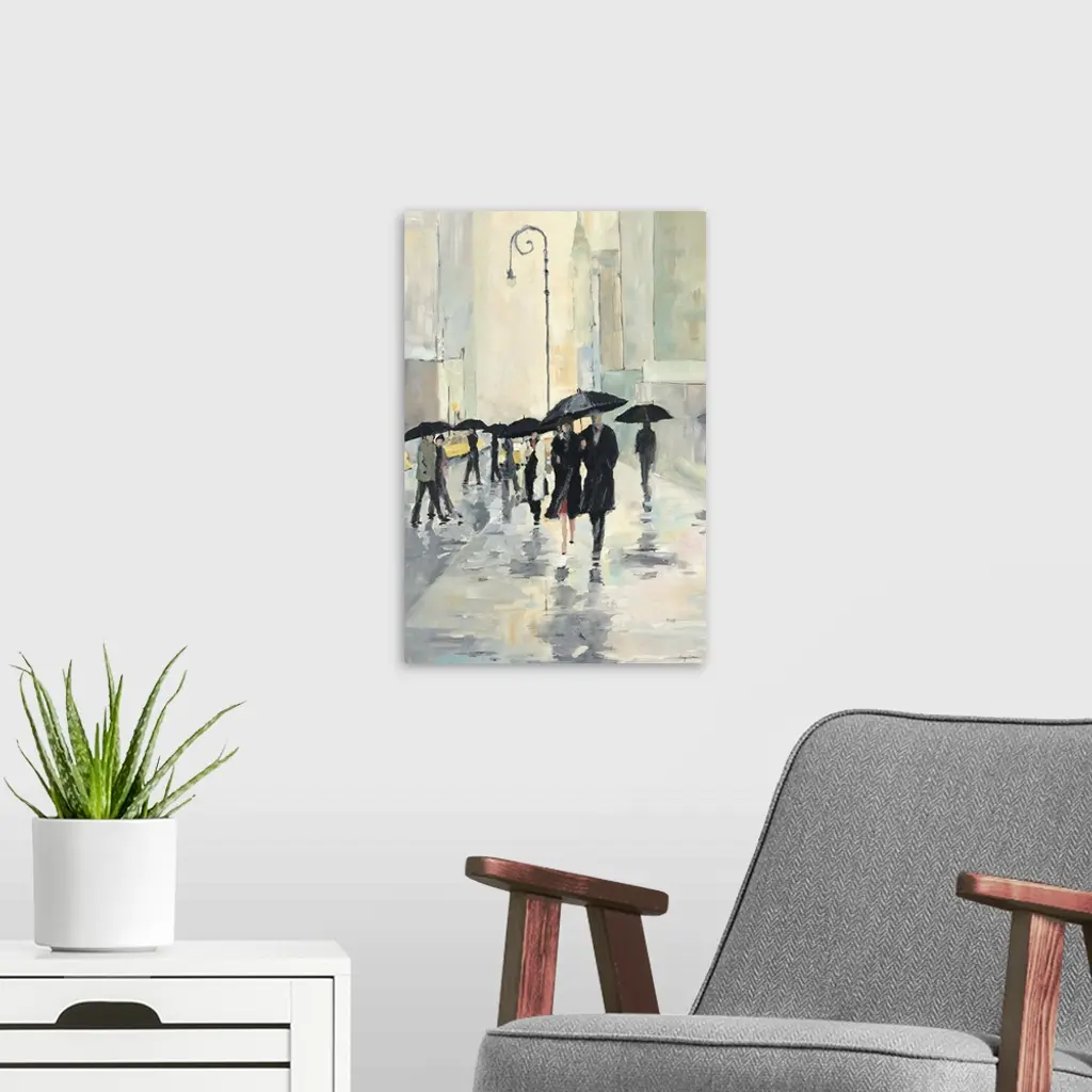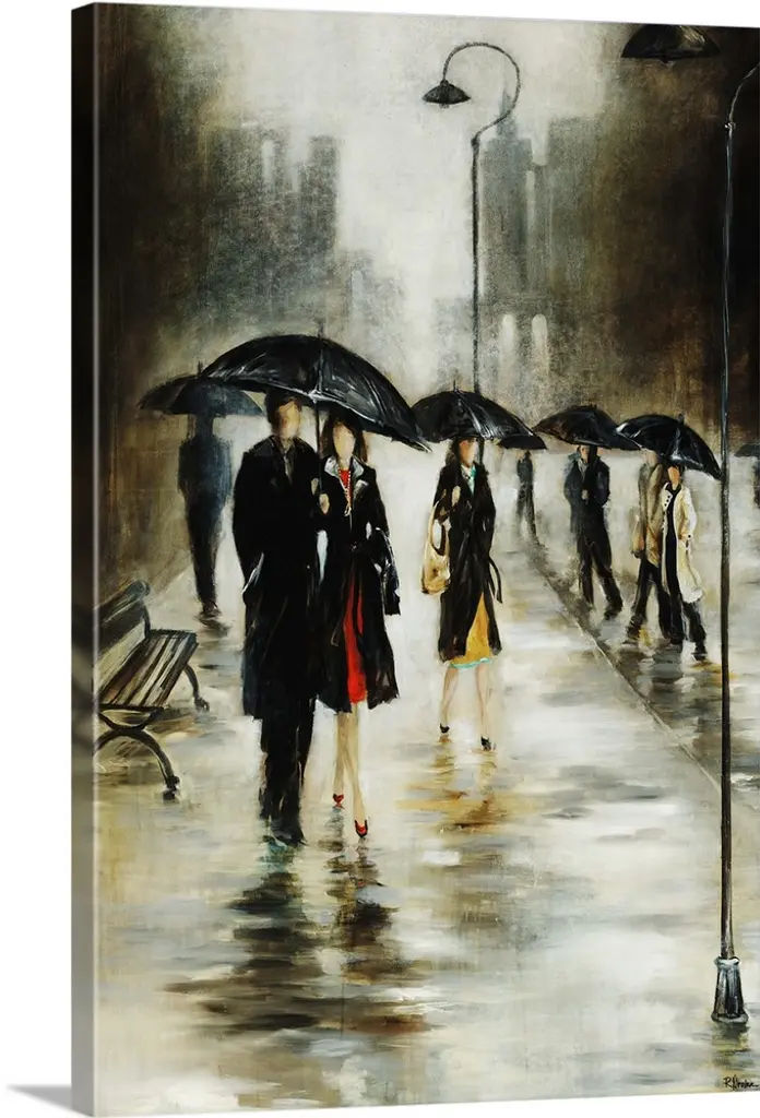Contemporary painting of people walking in the street downtown in the rain with umbrellas. Their reflections are seen in the wet city streets.