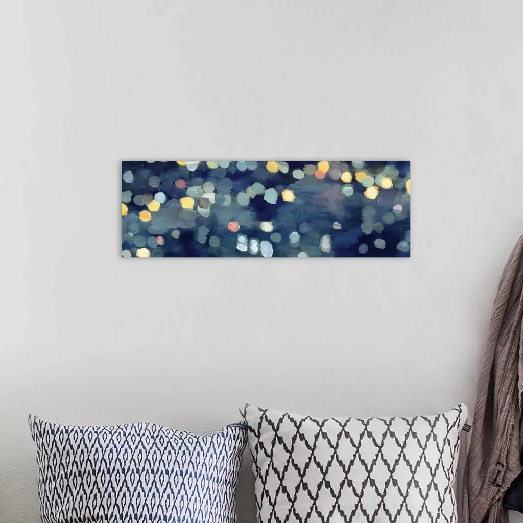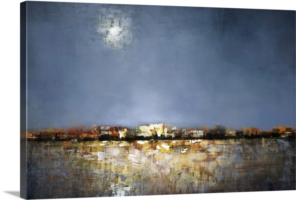 Abstract artwork in dark blue with gold and yellow shapes resembling blurred lights at night.