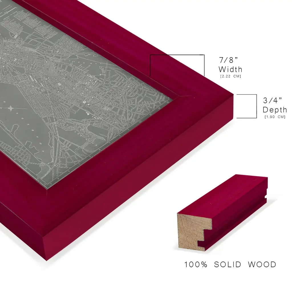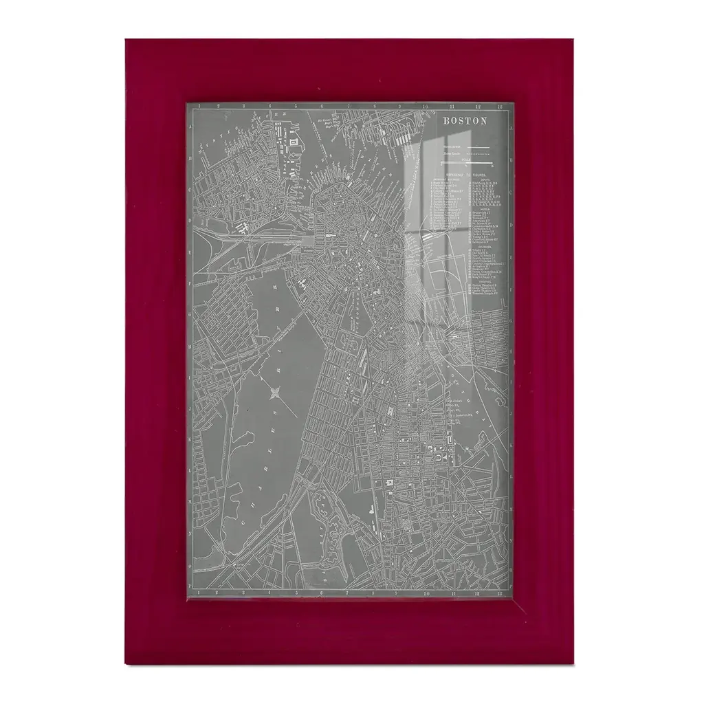City Map of Boston -EZ SWITCH Framed Print w/glass-Cherry Red A delightful, framed print. Featuring a solid wood frame with real wood glass. This premium print is giclee quality. In addition, every frame features a removable back and table top stand. This allows you to change your art in the future or to just stand the art on a table for a new look. We are sure you'll enjoy our new series of EZ SWITCH Framed Art. Solid Wood Frame Real Glass Removable / Replaceable Art Built in Tabletop Stand Sizes range from 4x6 up to 12x15 - buy just one or pair them up as sets as you see fit.