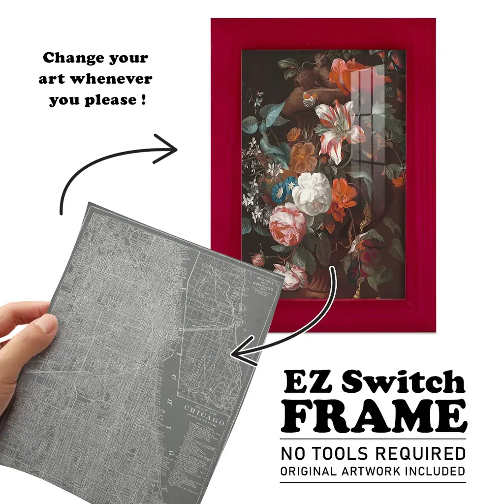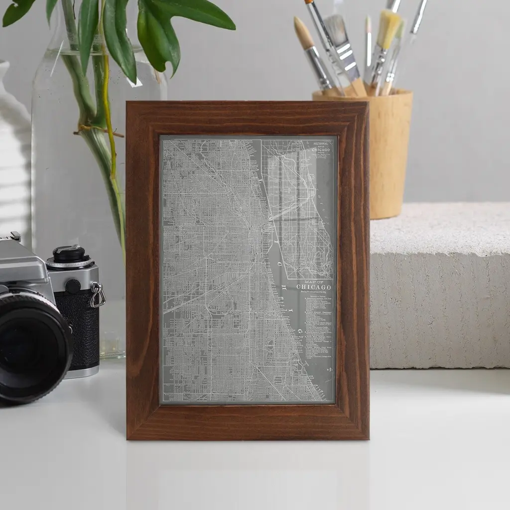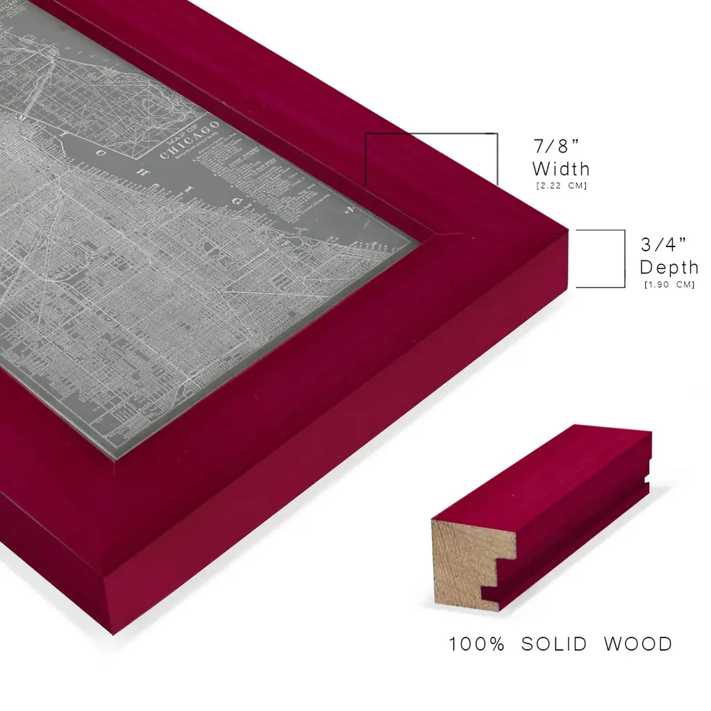 City Map of Chicago -EZ SWITCH Framed Print w/glass-Cherry Red A delightful, framed print. Featuring a solid wood frame with real wood glass. This premium print is giclee quality. In addition, every frame features a removable back and table top stand. This allows you to change your art in the future or to just stand the art on a table for a new look. We are sure you'll enjoy our new series of EZ SWITCH Framed Art. Solid Wood Frame Real Glass Removable / Replaceable Art Built in Tabletop Stand Sizes range from 4x6 up to 12x15 - buy just one or pair them up as sets as you see fit.