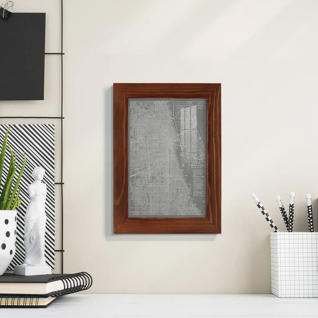 City Map of Chicago -EZ SWITCH Framed Print w/glass-Cherry Red A delightful, framed print. Featuring a solid wood frame with real wood glass. This premium print is giclee quality. In addition, every frame features a removable back and table top stand. This allows you to change your art in the future or to just stand the art on a table for a new look. We are sure you'll enjoy our new series of EZ SWITCH Framed Art. Solid Wood Frame Real Glass Removable / Replaceable Art Built in Tabletop Stand Sizes range from 4x6 up to 12x15 - buy just one or pair them up as sets as you see fit.