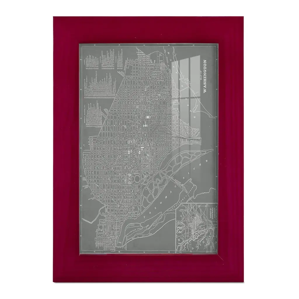 City Map of Washington D.C. -EZ SWITCH Framed Print w/glass-Cherry Red A delightful, framed print. Featuring a solid wood frame with real wood glass. This premium print is giclee quality. In addition, every frame features a removable back and table top stand. This allows you to change your art in the future or to just stand the art on a table for a new look. We are sure you'll enjoy our new series of EZ SWITCH Framed Art. Solid Wood Frame Real Glass Removable / Replaceable Art Built in Tabletop Stand Sizes range from 4x6 up to 12x15 - buy just one or pair them up as sets as you see fit.