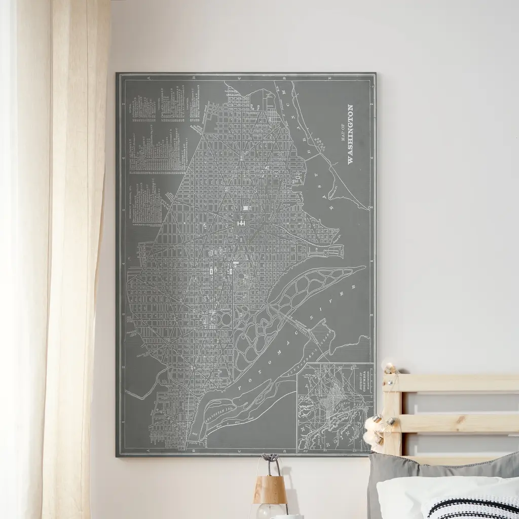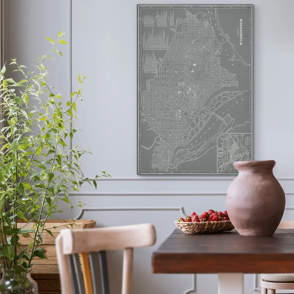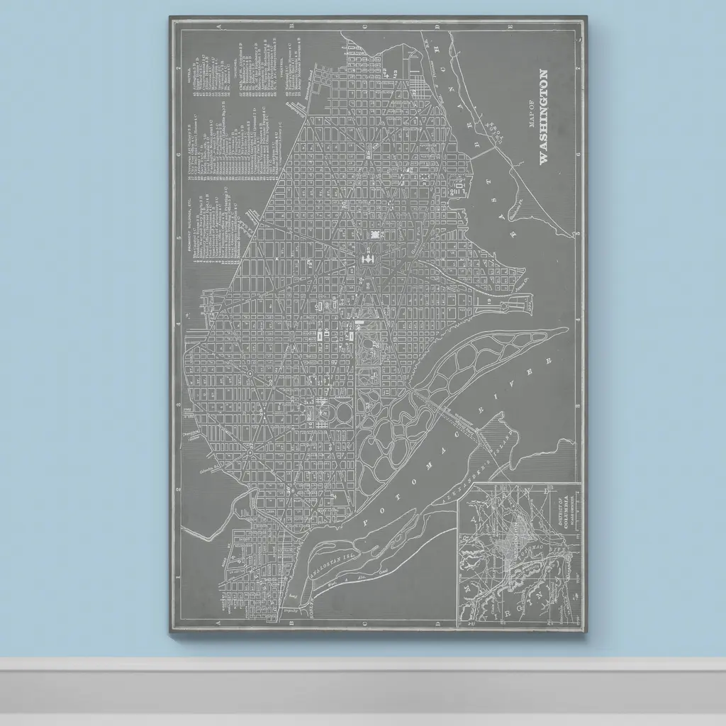 City Map of Washington D.C.-Premium Gallery Wrapped Canvas - Ready to Hang A premium hand stretched gallery wrapped canvas print created to last. Featuring a beveled a solid wood stretcher bar, each piece comes ready to hand 5 SIZES AVAILABLE 8''X12'' - Overall Size 16''x20'' - Overall Size 18''x27'' - Overall Size 24''x36'' - Overall Size 32''x48'' - Overall Size Each piece is made to order. Built to Last Each piece comes ready to hang Solid wood stretcher Fade and Water resistant Made domestically